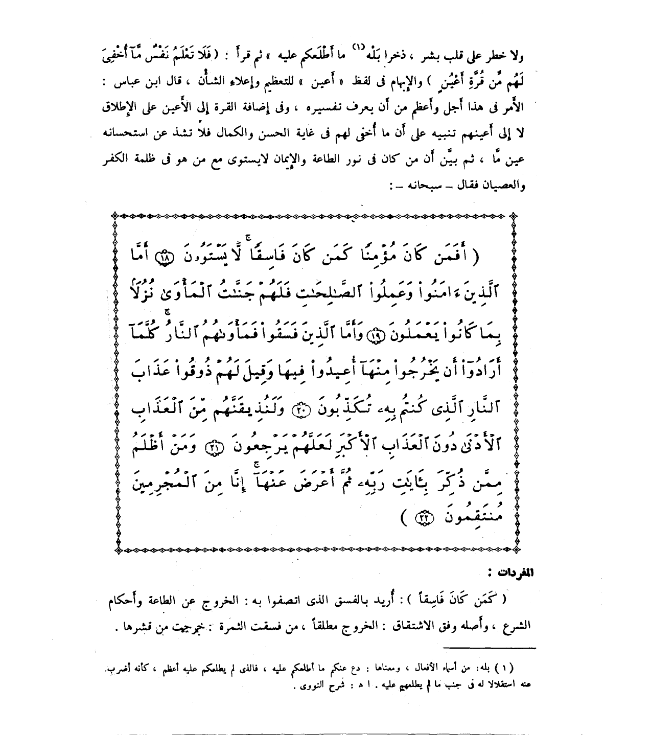 {أَفَمَنْ كَانَ مُؤْمِنًا كَمَنْ كَانَ فَاسِقًا لَا يَسْتَوُونَ (18) أَمَّا الَّذِينَ آمَنُوا وَعَمِلُوا الصَّالِحَاتِ فَلَهُمْ جَنَّاتُ الْمَأْوَى نُزُلًا بِمَا كَانُوا يَعْمَلُونَ (19) وَأَمَّا الَّذِينَ فَسَقُوا فَمَأْوَاهُمُ النَّارُ كُلَّمَا أَرَادُوا أَنْ يَخْرُجُوا مِنْهَا أُعِيدُوا فِيهَا وَقِيلَ لَهُمْ ذُوقُوا عَذَابَ النَّارِ الَّذِي كُنْتُمْ بِهِ تُكَذِّبُونَ (20) وَلَنُذِيقَنَّهُمْ مِنَ الْعَذَابِ الْأَدْنَى دُونَ الْعَذَابِ الْأَكْبَرِ لَعَلَّهُمْ يَرْجِعُونَ (21) وَمَنْ أَظْلَمُ مِمَّنْ ذُكِّرَ بِآيَاتِ رَبِّهِ ثُمَّ أَعْرَضَ عَنْهَا إِنَّا مِنَ الْمُجْرِمِينَ مُنْتَقِمُونَ (22)}
