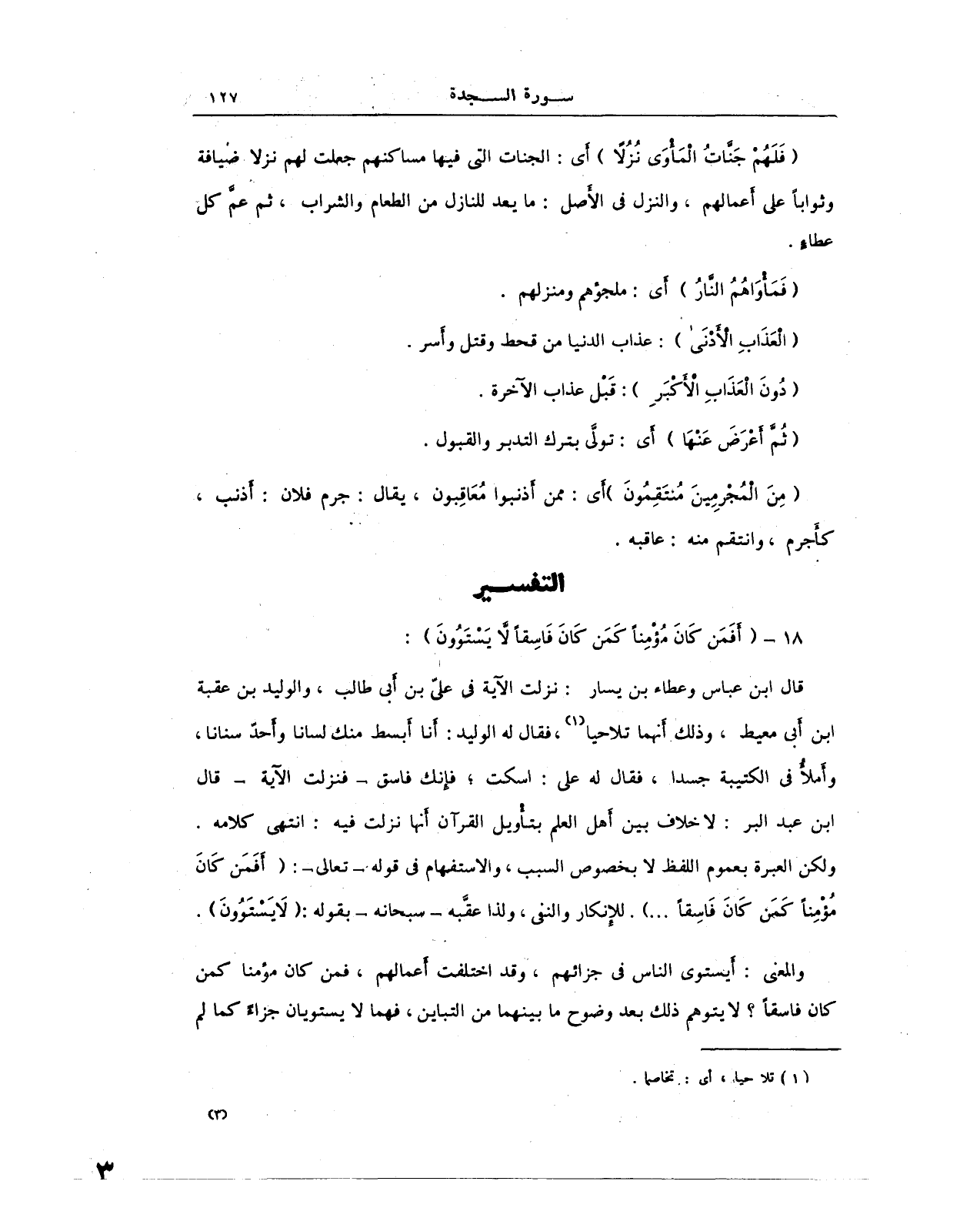 18 - {أَفَمَنْ كَانَ مُؤْمِنًا كَمَنْ كَانَ فَاسِقًا لَا يَسْتَوُونَ}: