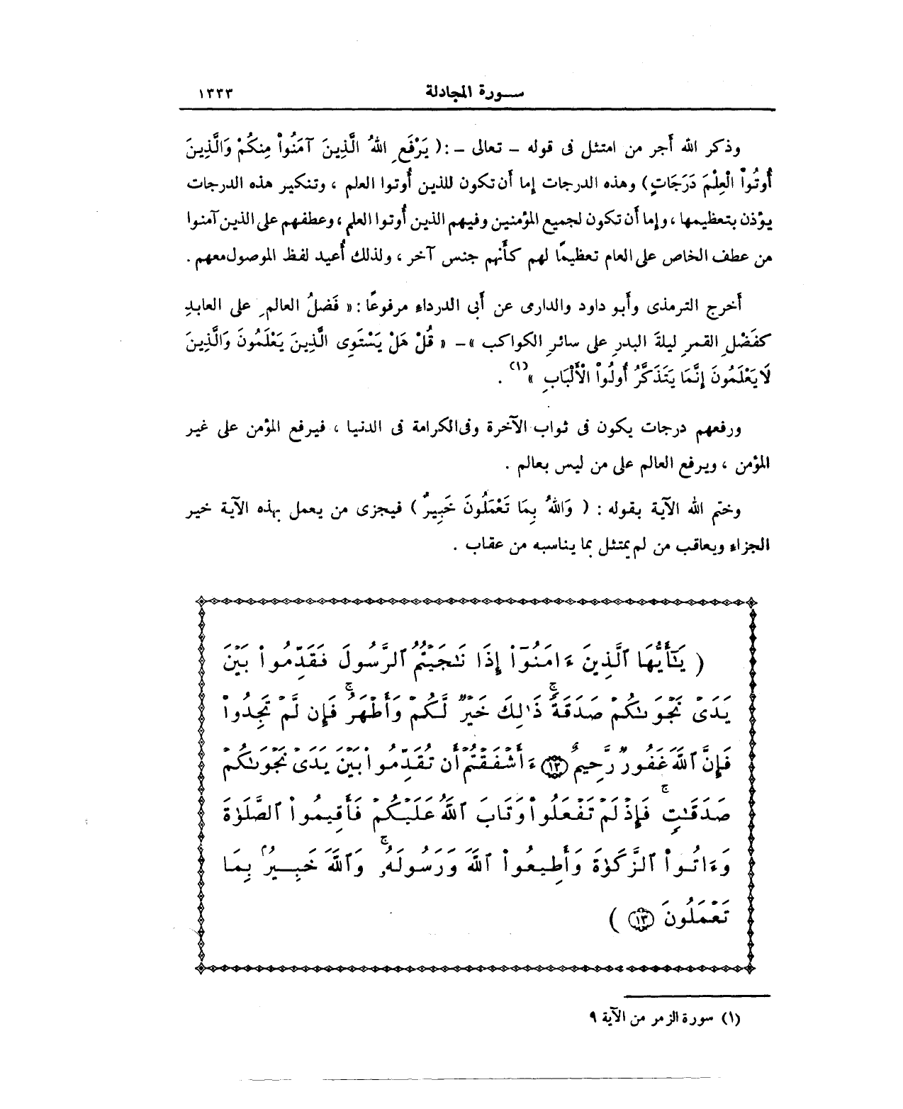 {يَا أَيُّهَا الَّذِينَ آمَنُوا إِذَا نَاجَيْتُمُ الرَّسُولَ فَقَدِّمُوا بَيْنَ يَدَيْ نَجْوَاكُمْ صَدَقَةً ذَلِكَ خَيْرٌ لَكُمْ وَأَطْهَرُ فَإِنْ لَمْ تَجِدُوا فَإِنَّ اللَّهَ غَفُورٌ رَحِيمٌ (12) أَأَشْفَقْتُمْ أَنْ تُقَدِّمُوا بَيْنَ يَدَيْ نَجْوَاكُمْ صَدَقَاتٍ فَإِذْ لَمْ تَفْعَلُوا وَتَابَ اللَّهُ عَلَيْكُمْ فَأَقِيمُوا الصَّلَاةَ وَآتُوا الزَّكَاةَ وَأَطِيعُوا اللَّهَ وَرَسُولَهُ وَاللَّهُ خَبِيرٌ بِمَا تَعْمَلُونَ (13)}