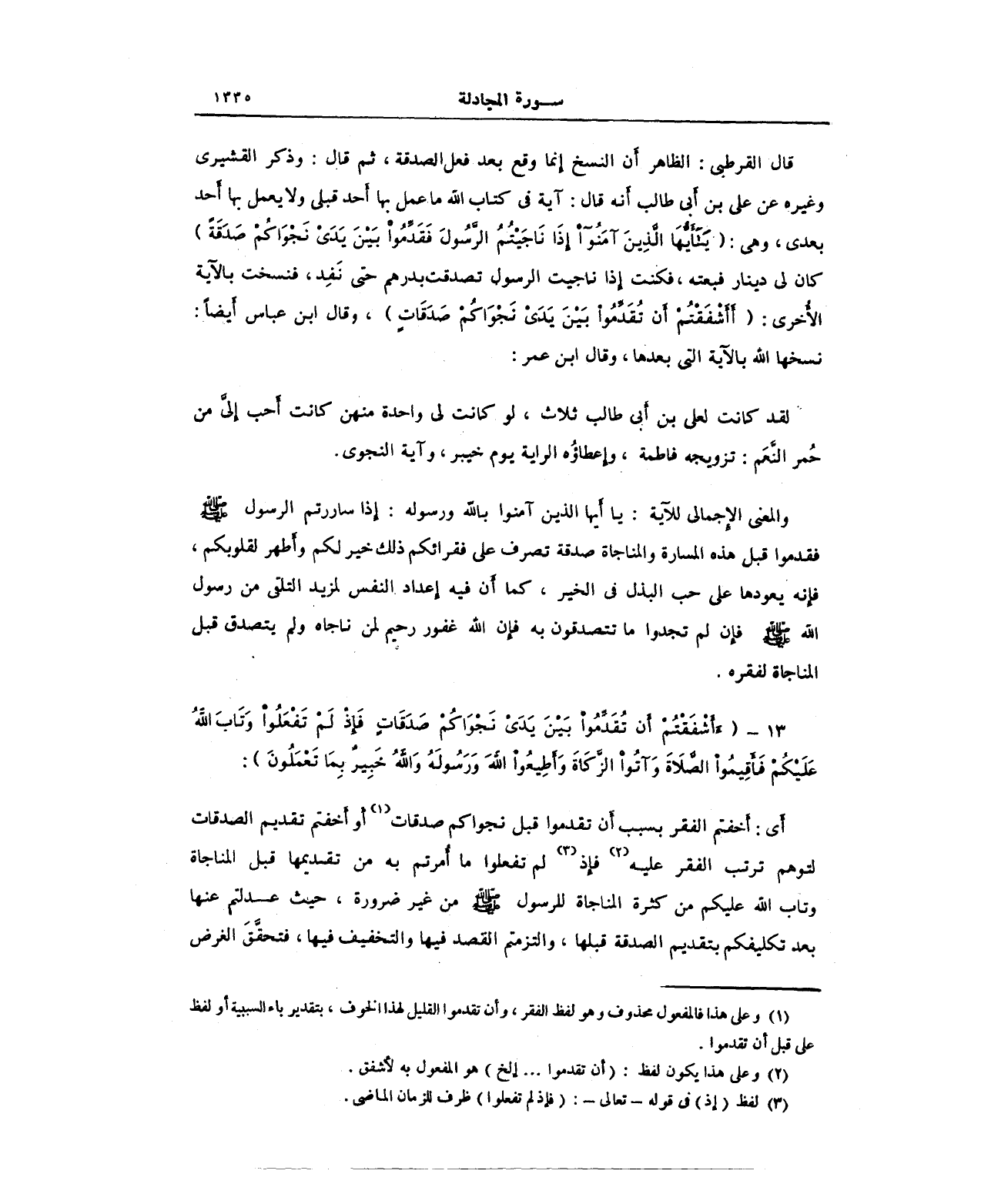 قال القرطبي: الظاهر أن النسخ إنما وقع بعد فعل الصدقة، ثم قال: وذكر القشيري وغيره عن علي بن أبي طالب أنه قال: آية في كتاب الله ما عمل بها أحد قبلي ولا يعمل بها أحد بعدي، وهي: (يَا أَيُّهَا الَّذِينَ آمَنُوا إِذَا نَاجَيْتُمْ الرَّسُولَ فَقَدِّمُوا بَيْنَ يَدَيْ نَجْوَاكُمْ صَدَقَةً) كان لي دينار فبعثه، فكنت إذا ناجيت الرسول تصدقت بدرهم حتى نَفِد، فنسخت بالآية الأخري: (أَأَشْفَقْتُمْ أَنْ تُقَدِّمُوا بَيْنَ يَدَيْ نَجْوَاكُمْ صَدَقَاتٍ)، وقال ابن عباس أيضا: نسخها الله بالآية التي بعدها، وقال ابن عمر:
