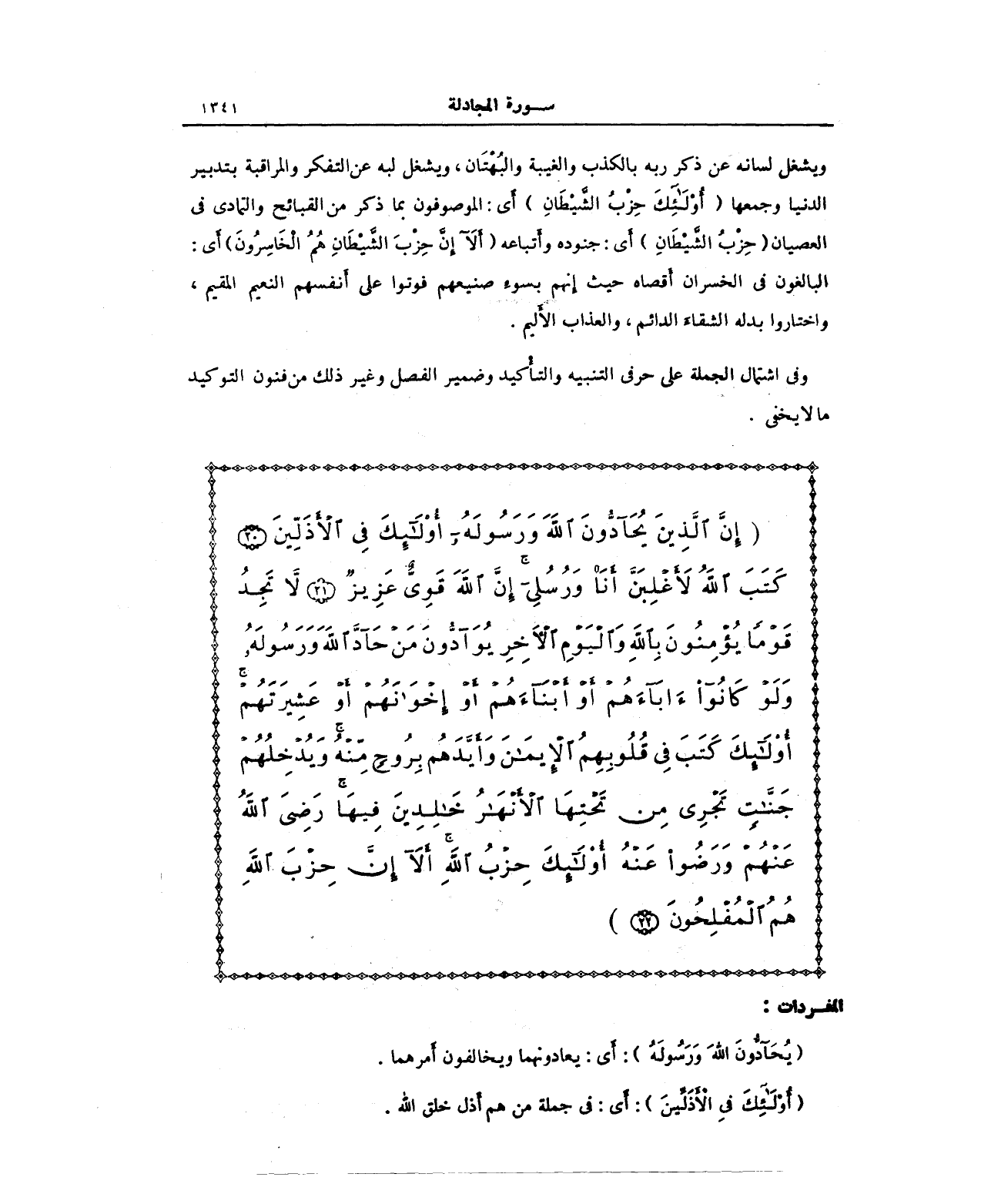 {إِنَّ الَّذِينَ يُحَادُّونَ اللَّهَ وَرَسُولَهُ أُولَئِكَ فِي الْأَذَلِّينَ (20) كَتَبَ اللَّهُ لَأَغْلِبَنَّ أَنَا وَرُسُلِي إِنَّ اللَّهَ قَوِيٌّ عَزِيزٌ (21) لَا تَجِدُ قَوْمًا يُؤْمِنُونَ بِاللَّهِ وَالْيَوْمِ الْآخِرِ يُوَادُّونَ مَنْ حَادَّ اللَّهَ وَرَسُولَهُ وَلَوْ كَانُوا آبَاءَهُمْ أَوْ أَبْنَاءَهُمْ أَوْ إِخْوَانَهُمْ أَوْ عَشِيرَتَهُمْ أُولَئِكَ كَتَبَ فِي قُلُوبِهِمُ الْإِيمَانَ وَأَيَّدَهُمْ بِرُوحٍ مِنْهُ وَيُدْخِلُهُمْ جَنَّاتٍ تَجْرِي مِنْ تَحْتِهَا الْأَنْهَارُ خَالِدِينَ فِيهَا رَضِيَ اللَّهُ عَنْهُمْ وَرَضُوا عَنْهُ أُولَئِكَ حِزْبُ اللَّهِ أَلَا إِنَّ حِزْبَ اللَّهِ هُمُ الْمُفْلِحُونَ (22)}