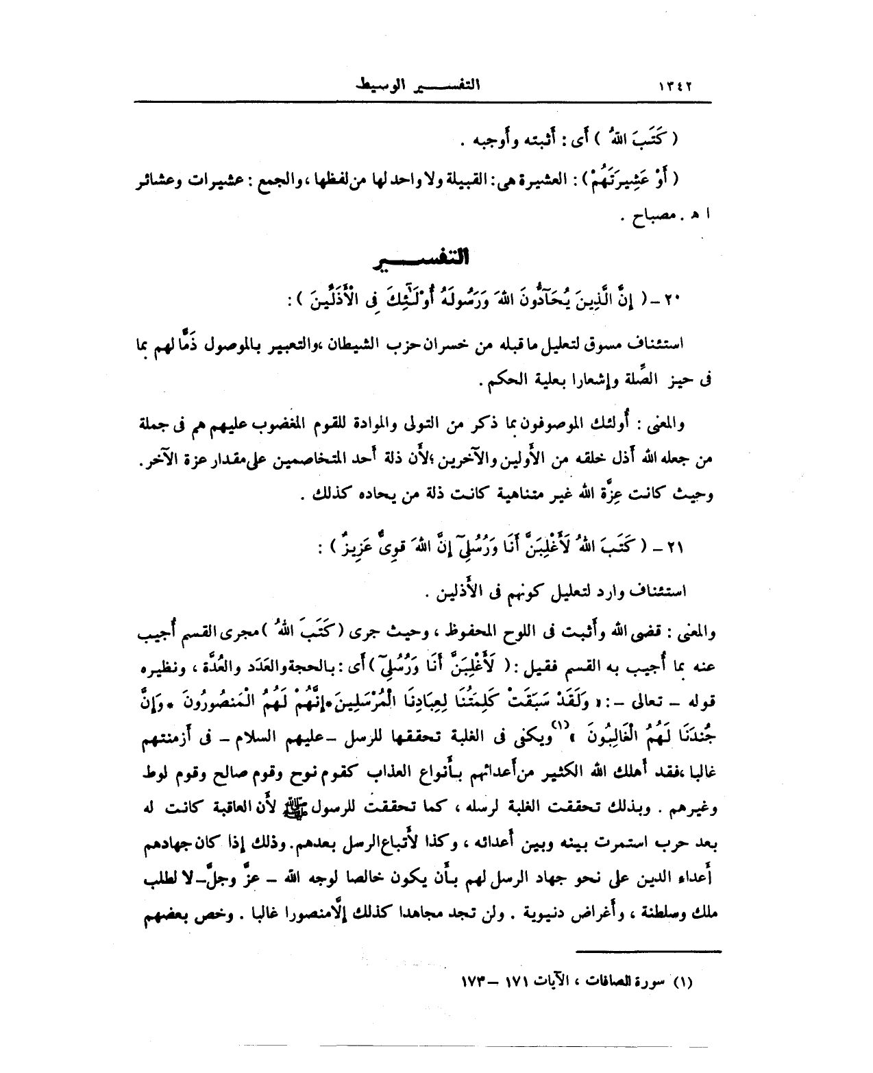 والمعنى: قضى الله وأَثبت في اللوح المحفوظ، حيث جري (كَتَبَ اللَّهُ) مجرى القسم أُجيب عنه بما أُجيب به القسم فقيل: (لأَغْلِبَنَّ أَنَا وَرُسُلِي) أَي: بالحجة والعَدَد والعُدَّة، ونظيره قوله تعالى: {وَلَقَدْ سَبَقَتْ كَلِمَتُنَا لِعِبَادِنَا الْمُرْسَلِينَ (171) إِنَّهُمْ لَهُمْ الْمَنصُورُونَ (172) وَإِنَّ جُندَنَا لَهُم الْغَالِبُونَ (173)} (¬1) ويكفي في الغلبة تحققها للرسل - عليهم - السلام - في أَزمنتهم غالبا، فقد أَهلك الله الكثير من أَعدائهم بأَنواع العذاب كقوم نوح وقوم صالح وقوم لوط وغيرهم. وبذلك تحققت الغلبة لرسله، كما تحققت للرسول صلى الله عليه وسلم لأَن العاقبة كانت له بعد حرب استمرت بينه وبين أَعدائه، وكذا لأَتباع الرسل وبعدهم وذلك إِذا كان جهادهم أَعداءِ الدين على نحو جهاد الرسل لهم بأَن يكون خالصا لوجه الله - عزَّ وجلَّ - لا لطلب ملك وسلطنه، وأَغراض دنيوية. ولن تجد مجاهدا كذلك إلاَّ منصورا غالبا. وخص بعضهم
