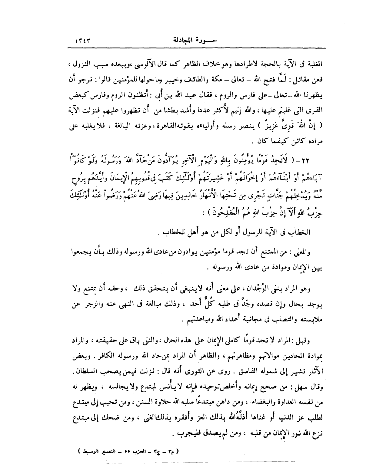 وقيل: المراد لا تجد قومًا كاملي الإِيمان على هذه الحال، والنفي باق على حقيقته، والمراد بموادة المحادين موالاتهم ومظاهرتهم، والظاهر أَن المراد بمن حاد الله ورسوله الكافر. وبعض الآثار تشير إِلي شموله الفاسق. روي عن الثوري أَنه قال: نزلت فيمن يصحب السلطان. وقال سهل: من صحح إِيمانه وأَخلص توحيده فإِنه لا يأنس لمبتدع ولا يجالسه، ويظهر له من نفسه العداوة والبغضاء، ومن داهن مبتدعًا سلبه الله حلاوة السنن، ومن تجبب إلى مبتدع لطلب عز الدنيا أَو غناها أَذلَّهُ الله بذلك العز وأَفقره بذلك الغنى، ومن ضحك إِلي مبتدع نزع الله نور الإِيمان من قلبه، ومن لم يصدق فليجرب.