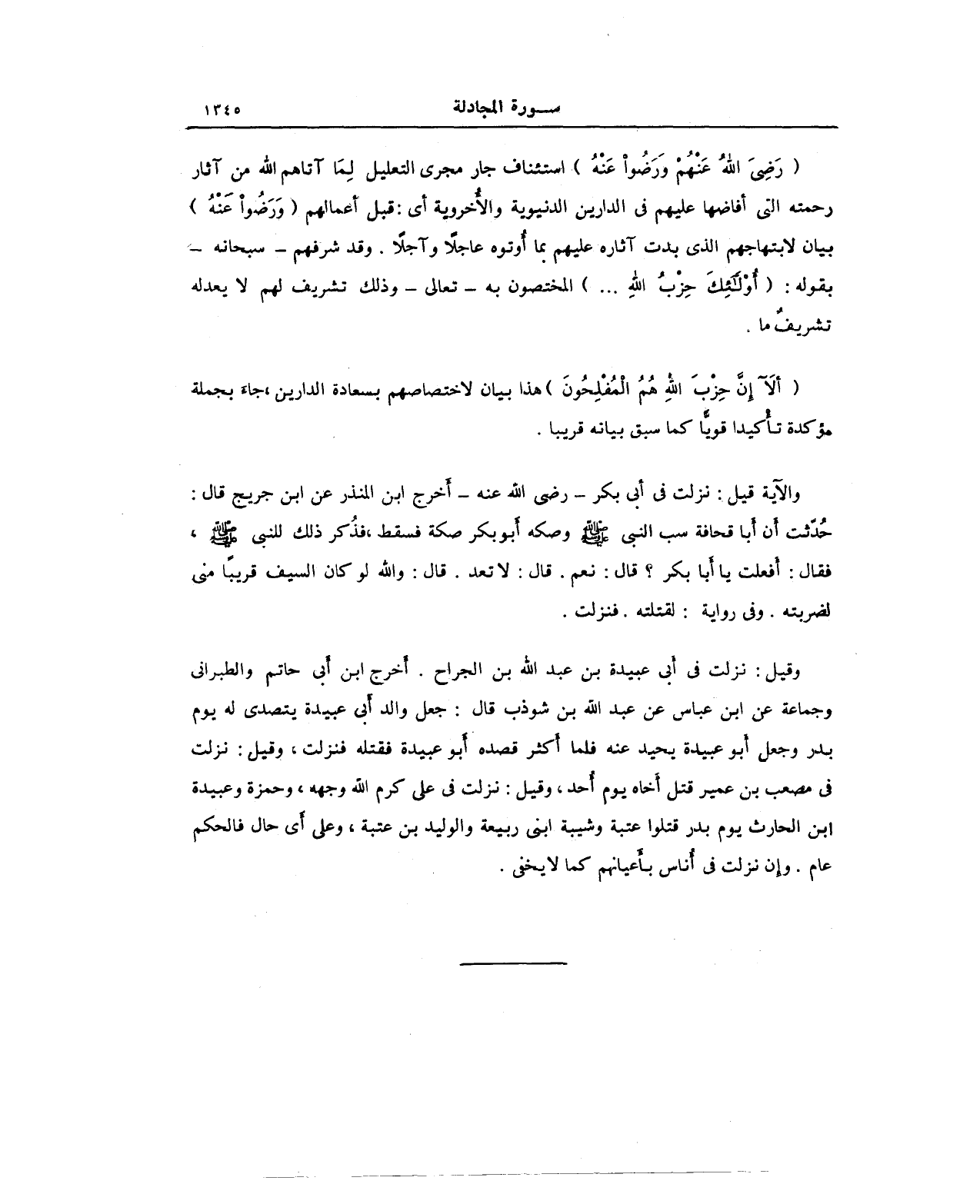 وقيل: نزلت في أبي عبيدة بن عبد الله بن الجراح. أخرج ابن أَبي حاتم والطبراني وجماعة عن ابن عباس عن عبد الله بن شوذب قال: جعل والد أَبي عبيدة يتصدى له يوم بدر وجعل أَبو عبيدة يحيد عنه فلما أَكثر قصده أَبو عبيدة فقتله فنزلت، وقيل: نزلت في مصعب بن عمير قتل أَخاه يوم أُحد، وقيل: نزلت في علي كرم الله وجهه، وحمزة وعبيدة ابن الحارث يوم بدر قتلوا عتبة وشيبه ابني ربيعة والوليد بن عتبة، وعلى أَي حال فالحكم عام. وإِن نزلت في أُناس بأَعيانهم كما لا يخفى.