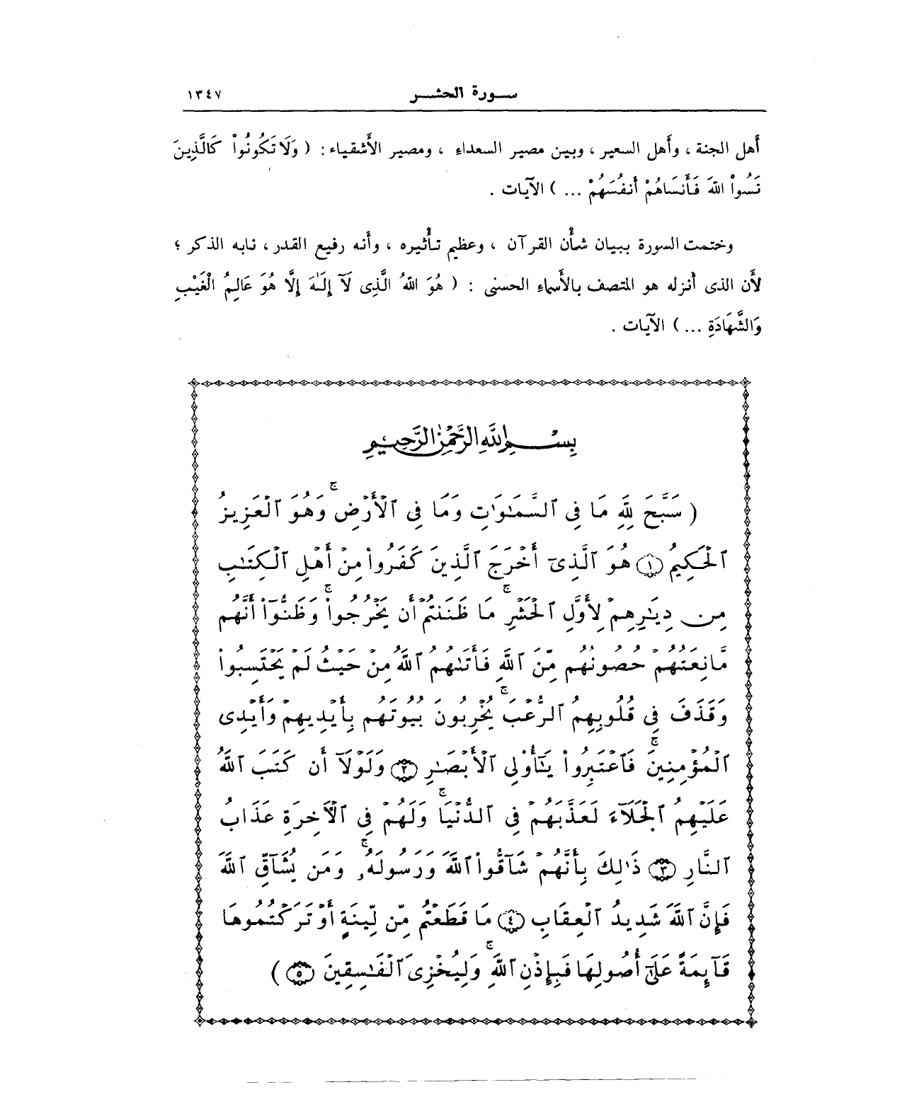{سَبَّحَ لِلَّهِ مَا فِي السَّمَاوَاتِ وَمَا فِي الْأَرْضِ وَهُوَ الْعَزِيزُ الْحَكِيمُ (1) هُوَ الَّذِي أَخْرَجَ الَّذِينَ كَفَرُوا مِنْ أَهْلِ الْكِتَابِ مِنْ دِيَارِهِمْ لِأَوَّلِ الْحَشْرِ مَا ظَنَنْتُمْ أَنْ يَخْرُجُوا وَظَنُّوا أَنَّهُمْ مَانِعَتُهُمْ حُصُونُهُمْ مِنَ اللَّهِ فَأَتَاهُمُ اللَّهُ مِنْ حَيْثُ لَمْ يَحْتَسِبُوا وَقَذَفَ فِي قُلُوبِهِمُ الرُّعْبَ يُخْرِبُونَ بُيُوتَهُمْ بِأَيْدِيهِمْ وَأَيْدِي الْمُؤْمِنِينَ فَاعْتَبِرُوا يَا أُولِي الْأَبْصَارِ (2) وَلَوْلَا أَنْ كَتَبَ اللَّهُ عَلَيْهِمُ الْجَلَاءَ لَعَذَّبَهُمْ فِي الدُّنْيَا وَلَهُمْ فِي الْآخِرَةِ عَذَابُ النَّارِ (3) ذَلِكَ بِأَنَّهُمْ شَاقُّوا اللَّهَ وَرَسُولَهُ وَمَنْ يُشَاقِّ اللَّهَ فَإِنَّ اللَّهَ شَدِيدُ الْعِقَابِ (4) مَا قَطَعْتُمْ مِنْ لِينَةٍ أَوْ تَرَكْتُمُوهَا قَائِمَةً عَلَى أُصُولِهَا فَبِإِذْنِ اللَّهِ وَلِيُخْزِيَ الْفَاسِقِينَ (5)}