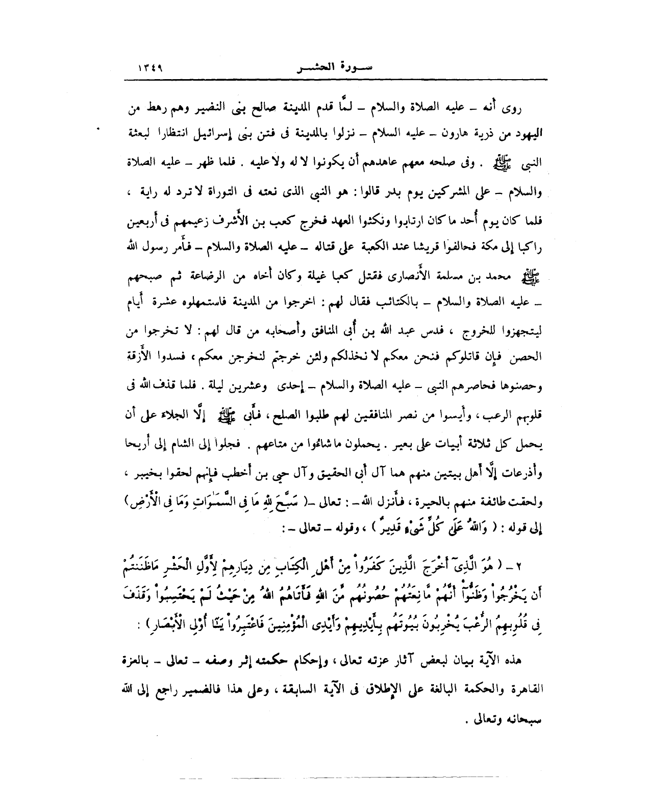 روي أَنه - عليه الصلاة والسلام - لمَّا قدم المدينة صالح بني النضير وهم رهط من اليهود من ذرية هارون - عليه السلام - نزلوا بالمدينة في فتن بني إِسرائيل انتظارا لبعثة النبي صلى الله عليه وسلم وفي صلحه معهم عاهدهم أَن يكونوا لا له ولا عليه. فلما ظهر - عليه الصلاة والسلام - على المشركين يوم بدر قالوا: هو النبي الذي نعته في التوراة لا ترد له رواية، فلما كان يوم أُحد ما كان ارتابوا ونكثوا العهد فخرج كعب بن الأَشراف زعيمهم في أَربعين راكبا إِلي مكة فخالفوا قريشا عند الكعبة على قتاله عليه الصلاة والسلام - فأَمر رسول الله صلى الله عليه وسلم محمد بن مسلمة الأَنصاري فقتل كعبا غيلة وكان أَخاه من الرضاعة ثم صبحهم - عليه الصلاة والسلام - بالكتائب فقال لهم: اخرجوا من المدينة فاستمهلوه عشرة أَيام ليتجهزوا للخروج، فدس عبد الله بن أُبي المنافق وأَصحابه من قال لهم: لا تخرجوا من الحصن فإِن قاتلوكم فنحن معكم لا نخذلكم ولئن خرجتم لنخرجن معكم، فسدوا الأَزقة وحصنوها فحاصرهم النبي - عليه الصلاة والسلام - إِحدي وعشرين ليلة فلما قذف الله في قلوبهم الرعب، وأَيسوا من نصر المنافقين لهم طلبوا الصلح، فأبى صلى الله عليه وسلم إلاَّ الجلاءَ على أن يحمل كل ثلاثة أبيات على بعير. يحملون ما شاءُوا من متاعهم. فجلوا إِلى الشام إِلى أَريحا وأَذرعات إلاَّ أَهل بيتين منهم هما آل أَبي الحقيق وآل حيي بن أَخطب فإِنهم لحقوا بخيبر، ولحقت طائفة منهم بالحيرة، فأَنزل الله: - تعالى - (سَبَّحَ لِلَّهِ مَا فِي السَّمَوَاتِ وَمَا فِي الأَرْضِ) إلي قوله: (وَاللَّهُ عَلَى كُلِّ شَيْءٍ قَدِيرٌ)، وقوله - تعالى -: