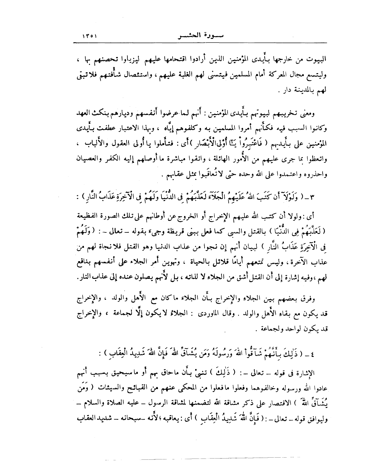 أَي: ولولا أَن كتب الله عليهم الإِخراج أو الخروج عن أَوطانهم على تلك الصورة الفظيعة (لَعَذَّبَهُمْ فِي الدُّنْيَا) بالقتل والسبي كما فعل ببني قريظة وجيء بقوله - تعالى - (وَلَهُمْ فِي الآخِرَةِ عَذَابُ النَّارِ) لبيان أَنهم إِن نجوا من عذاب الدنيا وهو القتل فلا نجاة لهم من عذاب الآخرة، وليس تمتعهم أَيامًا قلائل بالحياة، وتهوين أَمر الجلاء على أَنفسهم بنافع لهم، وفيه إِشارة إِلى أَن القتل أَشق من الجلاءِ لا لذاته، بل لأنهم يصلون عنده إلي عذاب النار.
