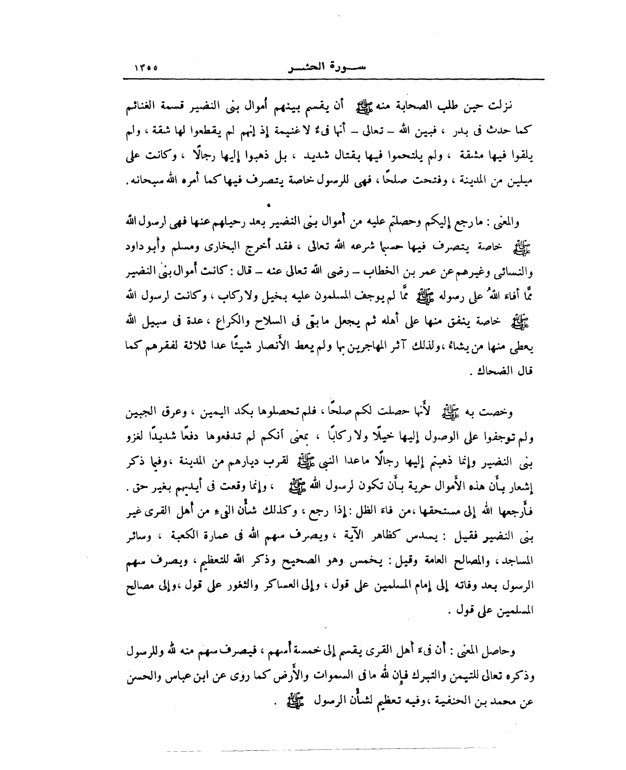 والمعنى: ما رجع إِليكم وحصلتم عليه من أَموال بني النضير بعد رحيلهم عنها فهي لرسول الله صلى الله عليه وسلم خاصة يتصرف فيها حسبما شرعه الله تعالى، فقد أَخرج البخاري ومسلم وأَبو داود والنسائي وغيرهم عن عمر بن الخطاب - رضي الله تعالى عنه -: قال: كانت أَموال بني النضير ممَّا أَفاءَ اللهُ على رسوله صلى الله عليه وسلم ممَّا لم يوجف المسلمون عليه بخيل ولا ركاب، وكانت لرسول الله صلى الله عليه وسلم خاصة يتفق منها على أَهله ثم يجعل ما بقي في السلاح والكراع، عدة في سبيل الله يعطي منها من يشاءُ، ولذلك آثر المهاجرين بها ولم يعط الأَنصار شيئا عدا ثلاثة لفقرهم كما قال الضحاك.