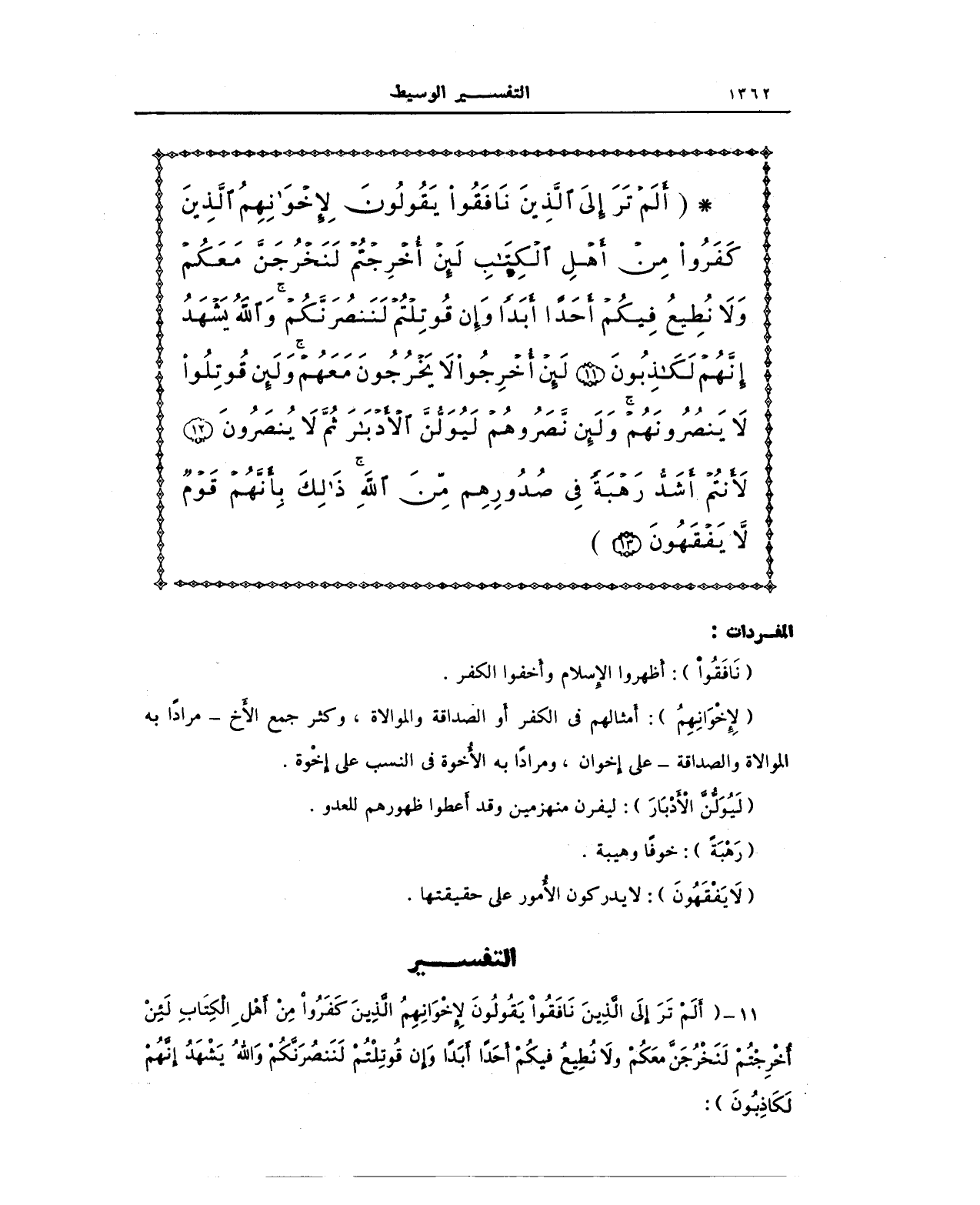 {أَلَمْ تَرَ إِلَى الَّذِينَ نَافَقُوا يَقُولُونَ لِإِخْوَانِهِمُ الَّذِينَ كَفَرُوا مِنْ أَهْلِ الْكِتَابِ لَئِنْ أُخْرِجْتُمْ لَنَخْرُجَنَّ مَعَكُمْ وَلَا نُطِيعُ فِيكُمْ أَحَدًا أَبَدًا وَإِنْ قُوتِلْتُمْ لَنَنْصُرَنَّكُمْ وَاللَّهُ يَشْهَدُ إِنَّهُمْ لَكَاذِبُونَ (11) لَئِنْ أُخْرِجُوا لَا يَخْرُجُونَ مَعَهُمْ وَلَئِنْ قُوتِلُوا لَا يَنْصُرُونَهُمْ وَلَئِنْ نَصَرُوهُمْ لَيُوَلُّنَّ الْأَدْبَارَ ثُمَّ لَا يُنْصَرُونَ (12) لَأَنْتُمْ أَشَدُّ رَهْبَةً فِي صُدُورِهِمْ مِنَ اللَّهِ ذَلِكَ بِأَنَّهُمْ قَوْمٌ لَا يَفْقَهُونَ (13)}