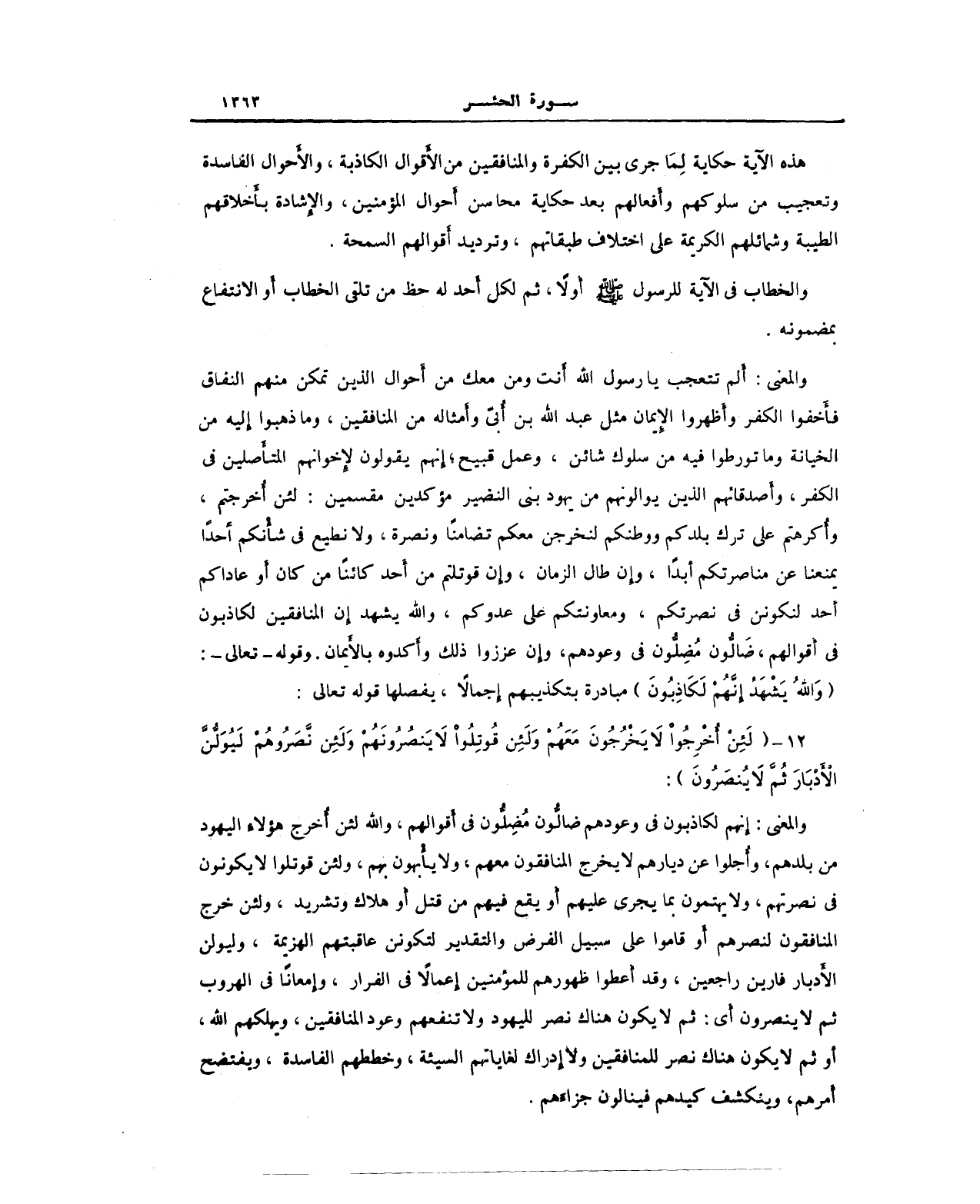 والمعنى: أَلم تتعجب يا رسول الله أَنت ومن معك من أَحوال الذين تمكن منهم النفاق فأَخفوا الكفر وأَظهروا الإيمان مثل عبد الله بن أُبيّ وأَمثاله من المنافقين، وما ذهبوا إِليه من الخيانة وما تورطوا فيه من سلوك شائن، وعمل قبيح، إِنهم يقولون لإِخوانهم المتأَصلين في الكفر، وأَصدقائهم الذين يوالونهم من يهود بني النضير مؤكدين مقسمين: لئن أُخرجتم، وأُكرهتم على ترك بلدكم ووطنكم لنخرجن معكم تضامنًا ونصرة، ولا نطيع في شأنكم أَحدًا يمنعنا عن مناصرتكم أبدًا، وإِن طال الزمان، وإِن قوتلتم من أَحد كائنًا من كان أَو عاداكم أَحد لنكونن في نصرتكم، ومعاونتكم على عدوكم، والله يشهد إِن المنافقين لكاذبون في أَقوالهم، ضَالُّون مُضِلُّون في وعودهم، وإِن عززوا ذلك وأَكدوه بالأَيمان. وقوله - تعالى -: (وَاللَّهُ يَشْهَدُ إِنَّهُمْ لَكَاذِبُونَ) مبادرة بتكذيبهم إِجمالًا، بفصلها قوله تعالى: