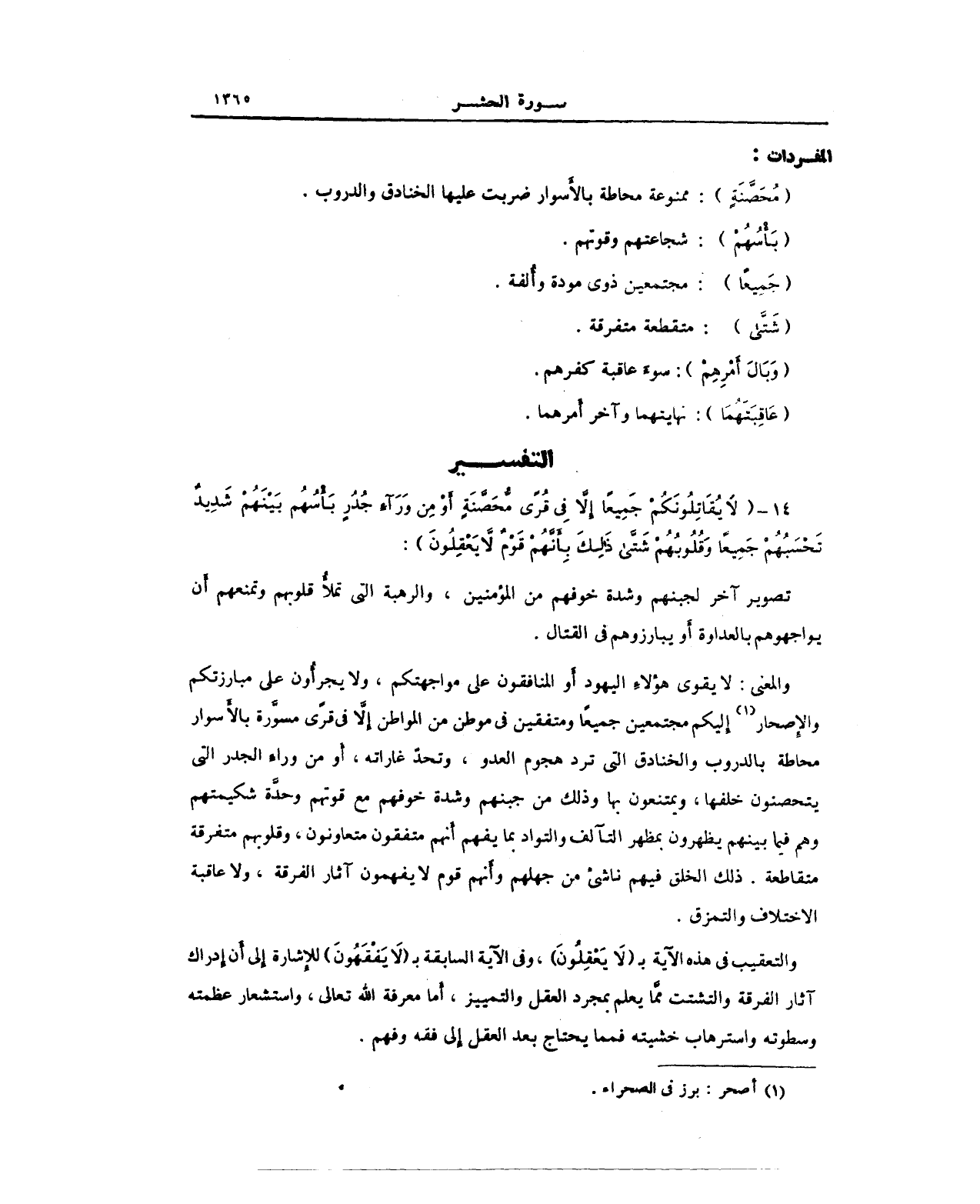 والمعنى: لا يقوي هؤلاءِ اليهود أَو المنافقون على مواجهتكم، ولا يجرأُون على مبارزتكم والإصحار (¬1) إِليكم مجتمعين جميعًا ومتفقين في موطن من المواطن إلاًّ في قرىً مسوَّرة بالأَسوار محاطة بالدروب والخنادق التي ترد هجوم العدو، وتحدّ غاراته، أَو من وراءِ الجدر التي يتحصنون خلفها، ويمتنعون بها وذلك من جبنهم وشدة خوفهم مع قوتهم وحدَّة شكيمتهم وهم فيما بينهم يظهرون بمظهر التآلف والتواد بما يفهم أَنهم متفقون متعاونون، وقلوبهم متفرقة متقاطعة. ذلك الخلق فيهم ناشيء من جهلهم وأَنهم قوم لا يفهمون آثار الفرقة، ولا عاقبة الاختلاف والتمزق.