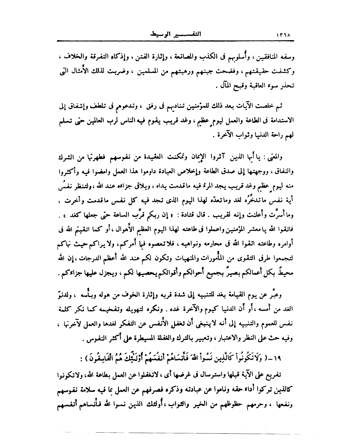 تفريع على الآية قبلها واسترسال في غرضها أي، لا تغفلوا عن العمل بطاعة الله، ولا تكونوا كالذين تركوا أداءَ حقه وناموا عن عبادته وذكره فصرفهم عن العمل بما فيه سلامة نفوسهم ونفعها، وحرمهم حظوظهم من الخير والثواب، أُولئك الذين نسوا الله فأَنساهم أَنفسهم