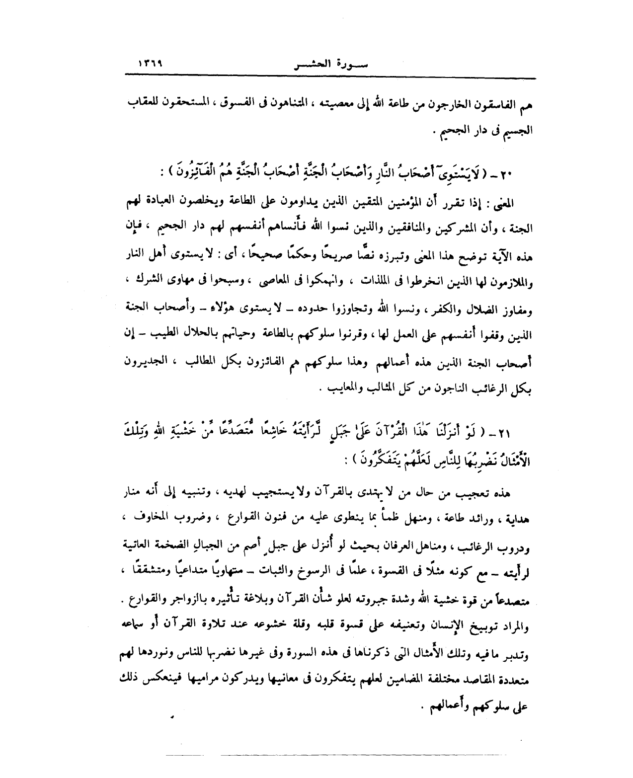 المعنى: إِذا تقرر أَن المؤمنين المتقين الذين يداومون على الطاعة ويخلصون العبادة لهم الجنة، وأَن المشركين والمنافقين والذين نسوا الله فأَنساهم أَنفسهم لهم دار الجحيم، فإِن هذه الآية توضح هذا المعنى وتبرزه نصًّا صريحًا وحكمًا صحيحا، أي: لا يستوي أَهل النار والملازمون لها الذين انخرطوا في الملذات، وانهمكوا في المعاصي، وسبحوا في مهاوي الشرك، ومفاوز الضلال والكفر، ونسوا الله وتجاوزوا حدوده - لا يستوي هؤلاءِ - وأَصحاب الجنة الذين وقفوا أنفسهم على العمل لها، وقرنوا سلوكهم بالطاعة وحياتهم بالحلال الطيب - إِن أَصحاب الجنة الذين هذه أَعمالهم وهذا سلوكهم هم الفائزون بكل المطالب، الجديرون بكل الرغائب الناجون من كل المثالب والمعايب.