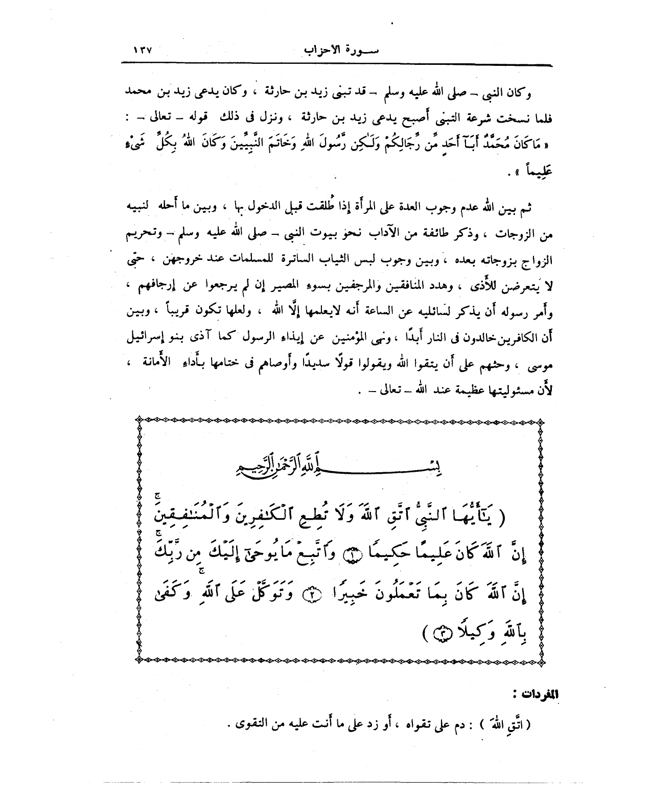 {يَا أَيُّهَا النَّبِيُّ اتَّقِ اللَّهَ وَلَا تُطِعِ الْكَافِرِينَ وَالْمُنَافِقِينَ إِنَّ اللَّهَ كَانَ عَلِيمًا حَكِيمًا (1) وَاتَّبِعْ مَا يُوحَى إِلَيْكَ مِنْ رَبِّكَ إِنَّ اللَّهَ كَانَ بِمَا تَعْمَلُونَ خَبِيرًا (2) وَتَوَكَّلْ عَلَى اللَّهِ وَكَفَى بِاللَّهِ وَكِيلًا (3)}