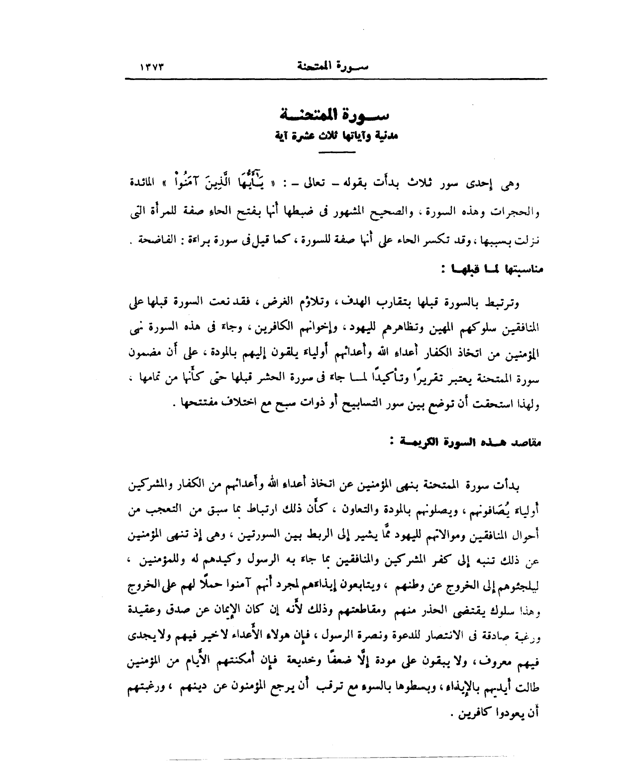 بدأَت سورة الممتحنة بنهي المؤمنين على اتخاذ أَعداءِ الله وأَعدائهم من الكفار والمشركين أَولياءَ يُصَافونهم، ويصلونهم بالمودة والتعاون، كأَن ذلك ارتباط بما سبق من التعجب من أَحوال المنافقين وموالاتهم لليهود ممَّا يشير إِلي الربط بين السورتين، وهي إِذ تنهي المؤمنين عن ذلك تنبه إِلي كفر المشركين والمنافقين بما جاءَ به الرسول وكيدهم له وللمؤمنين، ليلجئوهم إِلي الخروج عن وطنهم، ويتابعون إِيذاءَهم لمجرد أَنهم آمنوا حملًا لهم على الخروج وهذا سلوك يقتضي الحذر منهم ومقاطعتهم وذلك لأَنه إِن كان الإِيمان عن صدق وعقيدة ورغبة صادقة في الانتصار للدعوة ونصرة الرسول، فإِن هولاءِ الأَعداء لا خير فيهم ولا يجدي فيهم معروف، ولا يبقون على مودة إِلَّا ضعفًا وخديعة فإِن أَمكنتهم الأَيام من المؤمنين طالت أَيديهم بالإِيذاءِ، وبسطوها بالسوءِ مع ترقب أَن يرجع المؤمنون عن دينهم، ورغبتهم أَن يعودوا كافرين.