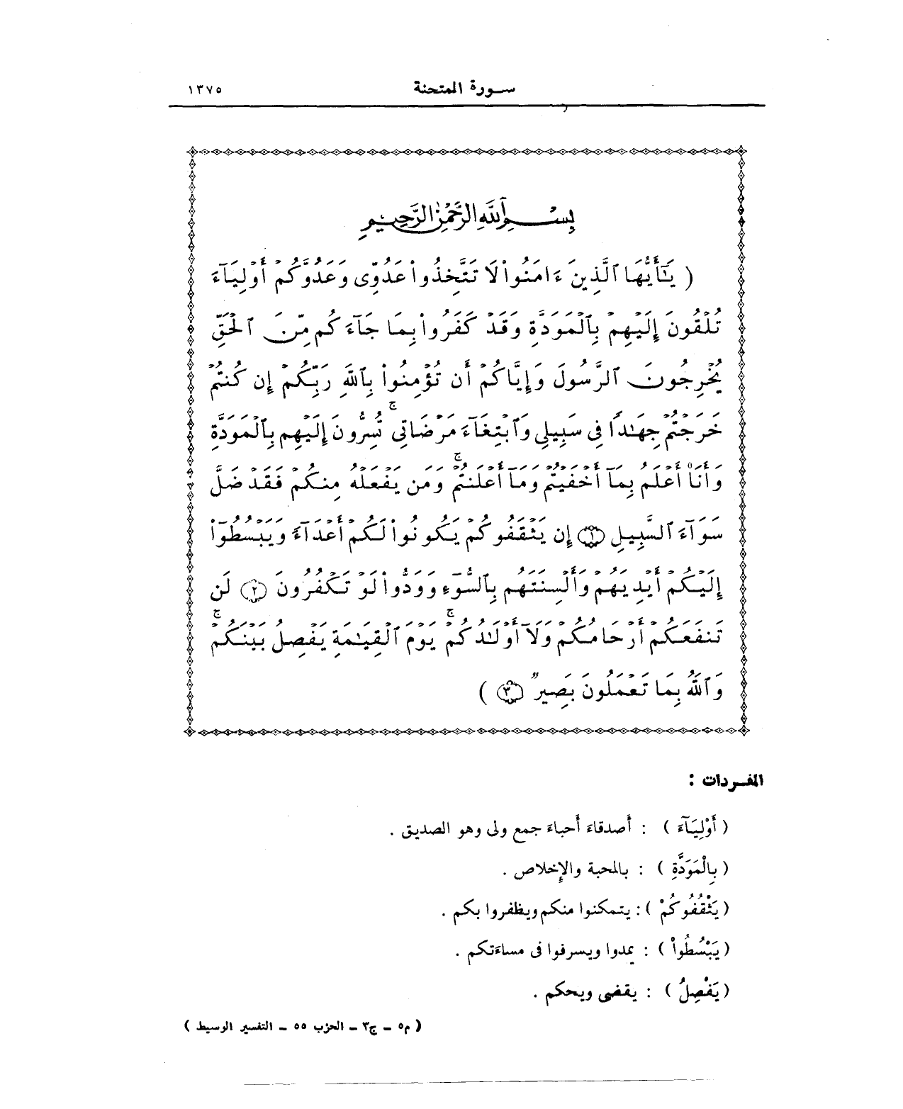 {يَا أَيُّهَا الَّذِينَ آمَنُوا لَا تَتَّخِذُوا عَدُوِّي وَعَدُوَّكُمْ أَوْلِيَاءَ تُلْقُونَ إِلَيْهِمْ بِالْمَوَدَّةِ وَقَدْ كَفَرُوا بِمَا جَاءَكُمْ مِنَ الْحَقِّ يُخْرِجُونَ الرَّسُولَ وَإِيَّاكُمْ أَنْ تُؤْمِنُوا بِاللَّهِ رَبِّكُمْ إِنْ كُنْتُمْ خَرَجْتُمْ جِهَادًا فِي سَبِيلِي وَابْتِغَاءَ مَرْضَاتِي تُسِرُّونَ إِلَيْهِمْ بِالْمَوَدَّةِ وَأَنَا أَعْلَمُ بِمَا أَخْفَيْتُمْ وَمَا أَعْلَنْتُمْ وَمَنْ يَفْعَلْهُ مِنْكُمْ فَقَدْ ضَلَّ سَوَاءَ السَّبِيلِ (1) إِنْ يَثْقَفُوكُمْ يَكُونُوا لَكُمْ أَعْدَاءً وَيَبْسُطُوا إِلَيْكُمْ أَيْدِيَهُمْ وَأَلْسِنَتَهُمْ بِالسُّوءِ وَوَدُّوا لَوْ تَكْفُرُونَ (2) لَنْ تَنْفَعَكُمْ أَرْحَامُكُمْ وَلَا أَوْلَادُكُمْ يَوْمَ الْقِيَامَةِ يَفْصِلُ بَيْنَكُمْ وَاللَّهُ بِمَا تَعْمَلُونَ بَصِيرٌ (3)}