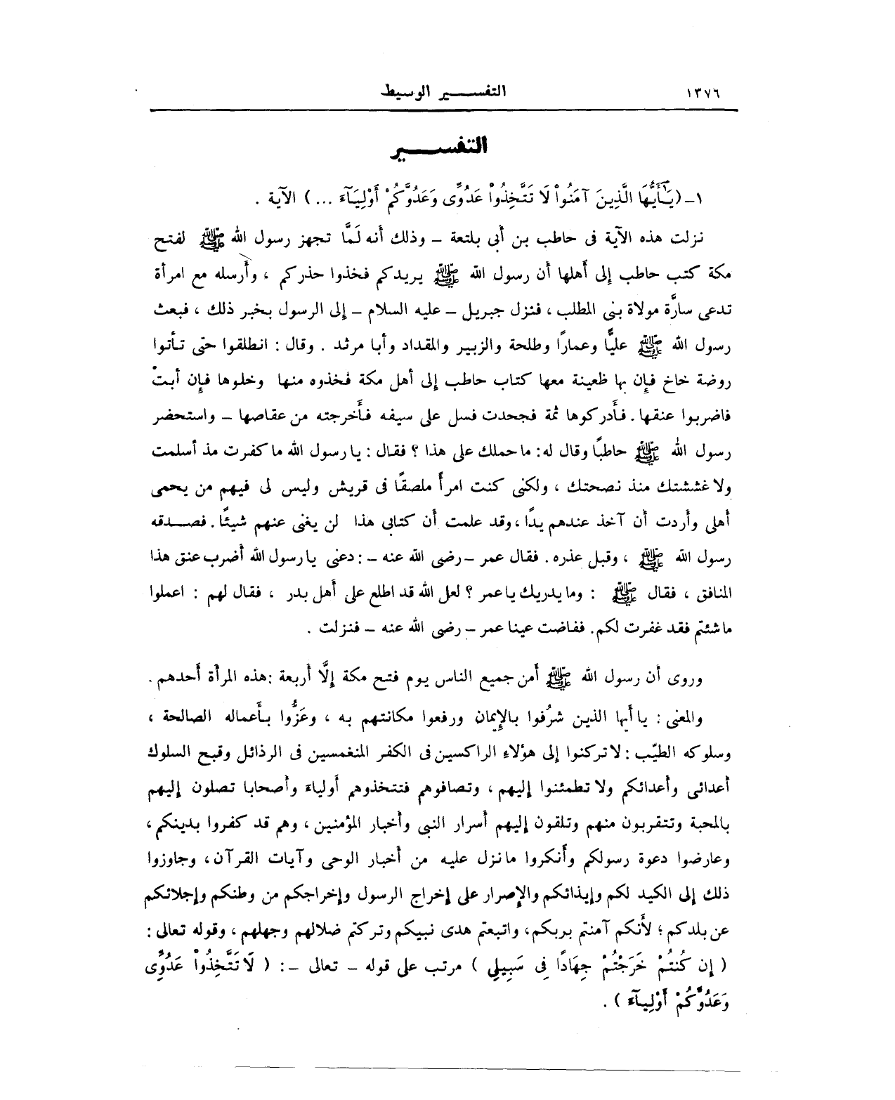 1 - {يَا أَيُّهَا الَّذِينَ آمَنُوا لَا تَتَّخِذُوا عَدُوِّي وَعَدُوَّكُمْ أَوْلِيَاءَ ... } الآية.
