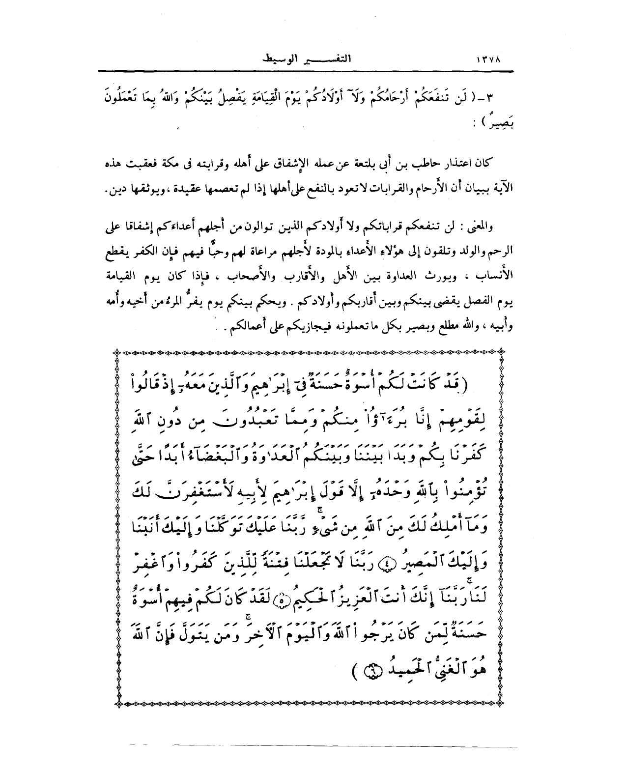 {قَدْ كَانَتْ لَكُمْ أُسْوَةٌ حَسَنَةٌ فِي إِبْرَاهِيمَ وَالَّذِينَ مَعَهُ إِذْ قَالُوا لِقَوْمِهِمْ إِنَّا بُرَآءُ مِنْكُمْ وَمِمَّا تَعْبُدُونَ مِنْ دُونِ اللَّهِ كَفَرْنَا بِكُمْ وَبَدَا بَيْنَنَا وَبَيْنَكُمُ الْعَدَاوَةُ وَالْبَغْضَاءُ أَبَدًا حَتَّى تُؤْمِنُوا بِاللَّهِ وَحْدَهُ إِلَّا قَوْلَ إِبْرَاهِيمَ لِأَبِيهِ لَأَسْتَغْفِرَنَّ لَكَ وَمَا أَمْلِكُ لَكَ مِنَ اللَّهِ مِنْ شَيْءٍ رَبَّنَا عَلَيْكَ تَوَكَّلْنَا وَإِلَيْكَ أَنَبْنَا وَإِلَيْكَ الْمَصِيرُ (4) رَبَّنَا لَا تَجْعَلْنَا فِتْنَةً لِلَّذِينَ كَفَرُوا وَاغْفِرْ لَنَا رَبَّنَا إِنَّكَ أَنْتَ الْعَزِيزُ الْحَكِيمُ (5) لَقَدْ كَانَ لَكُمْ فِيهِمْ أُسْوَةٌ حَسَنَةٌ لِمَنْ كَانَ يَرْجُو اللَّهَ وَالْيَوْمَ الْآخِرَ وَمَنْ يَتَوَلَّ فَإِنَّ اللَّهَ هُوَ الْغَنِيُّ الْحَمِيدُ (6)}