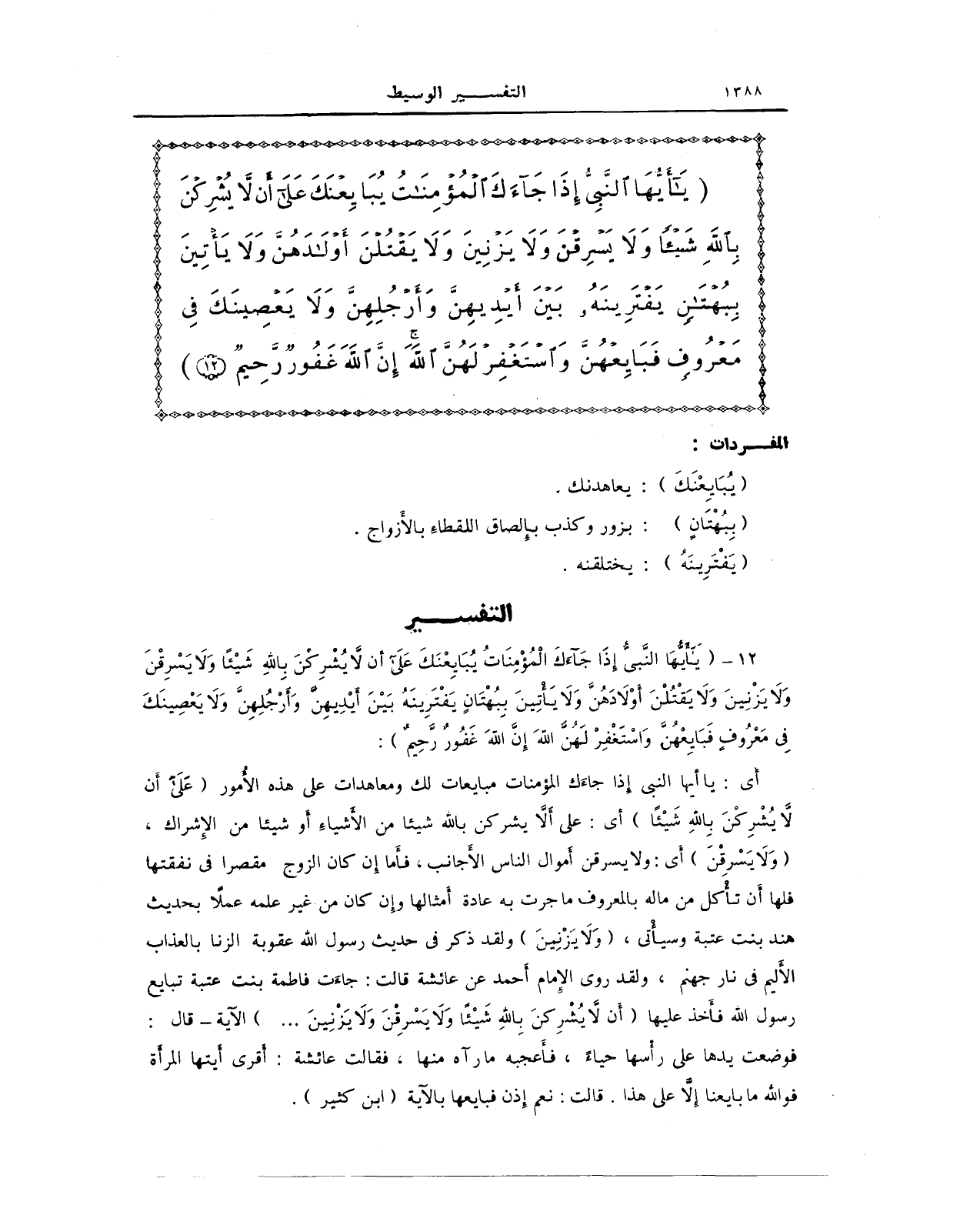 12 - {يَا أَيُّهَا النَّبِيُّ إِذَا جَاءَكَ الْمُؤْمِنَاتُ يُبَايِعْنَكَ عَلَى أَنْ لَا يُشْرِكْنَ بِاللَّهِ شَيْئًا وَلَا يَسْرِقْنَ وَلَا يَزْنِينَ وَلَا يَقْتُلْنَ أَوْلَادَهُنَّ وَلَا يَأْتِينَ بِبُهْتَانٍ يَفْتَرِينَهُ بَيْنَ أَيْدِيهِنَّ وَأَرْجُلِهِنَّ وَلَا يَعْصِينَكَ فِي مَعْرُوفٍ فَبَايِعْهُنَّ وَاسْتَغْفِرْ لَهُنَّ اللَّهَ إِنَّ اللَّهَ غَفُورٌ رَحِيمٌ (12)}: