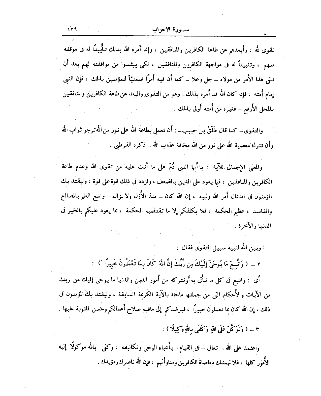 تقوى لله، وأبعدهم عن طاعة الكافرين والمنافقين، وإنما أمره الله بذلك تأييدًا له في موقفه منهم، وتثبيتًا له في مواجهة الكافرين والمنافقين، لكي ييئسوا من موافقته لهم بعد أن تلقى هذا الأمر من مولاه - جل وعلا - كما أن فيه أمرًا ضمنيًا للمؤمنين بذلك، فإن النبي إمام أُمته، فإذا كان الله قد أمره بذلك - وهو من التقوى والبعد عن طاعة الكافرين والمنافقين بالمحل الأرفع - فغيره من أمته أولى بذلك.