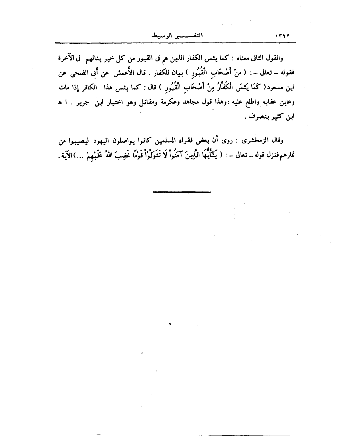 والقول الثاني معناه: كما يئس الكفار الذين هم في القبور من كل خير ينالهم في الآخرة فقوله - تعالى -: (مِنْ أَصْحَابِ الْقُبُورِ) بيان للكفار. قال الأَعمش عن أَبي الضحى عن ابن مسعود (كَمَا يَئِسَ الْكُفَّارُ مِنْ أَصْحَابِ الْقُبُورِ) قال: كما يئس هذا الكافر إِذا مات وعاين عقابه واطلع عليه، وهذا قول مجاهد وعكرمة ومقاتل وهو اختيار ابن جرير. أ. هـ ابن كثير بتصرف.