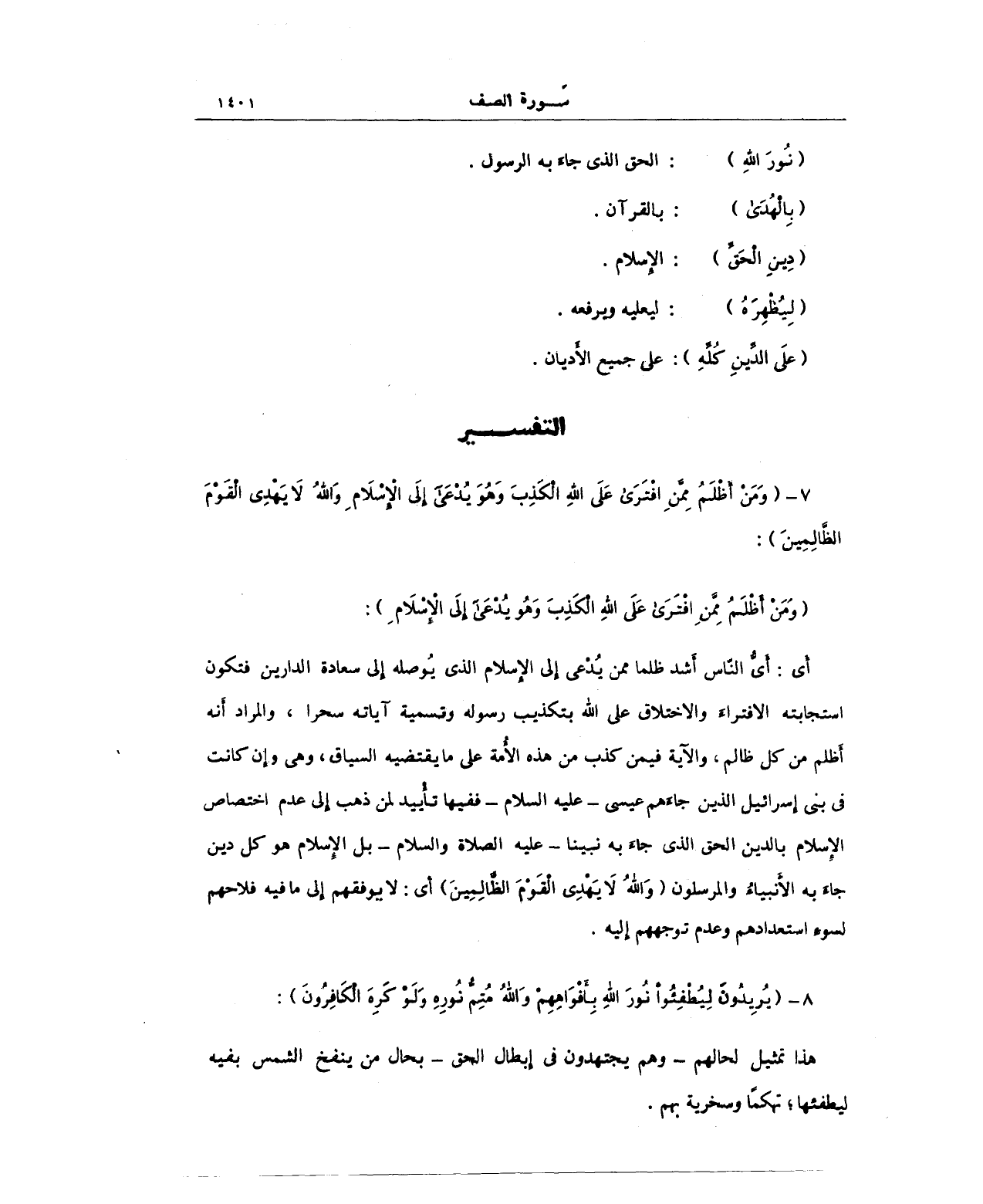 أَي: أيُّ النّاس أَشد ظلما ممن يُدْعى إِلى الإِسلام الذي يُوصله إِلى سعادة الدارين فتكون استجابته الافتراءَ والاختلاق على الله بتكذيب رسوله وتسمية آياته سحرا، والمراد أَنه أَظلم من كل ظالم، والآية فيمن كذب من هذه الأُمة على ما يقتضيه السياق، وهي إِن كانت في بني إِسرائيل الذين جاءَهم عيسى عليه السلام - ففيها تأييد لمن ذهب إِلى عدم اختصاص الإِسلام بالدين الحق الذي جاءَ به نبينا عليه الصلاة والسلام - بل الإِسلام هو كل دين جاءَ به الأَنبياءُ والمرسلون (وَاللَّهُ لا يَهْدِي الْقَوْمَ الظَّالِمِينَ) أَي: لا يوفقهم إِلى ما فيه فلاحهم لسوءِ استعدادهم وعدم توجههم إِليه.