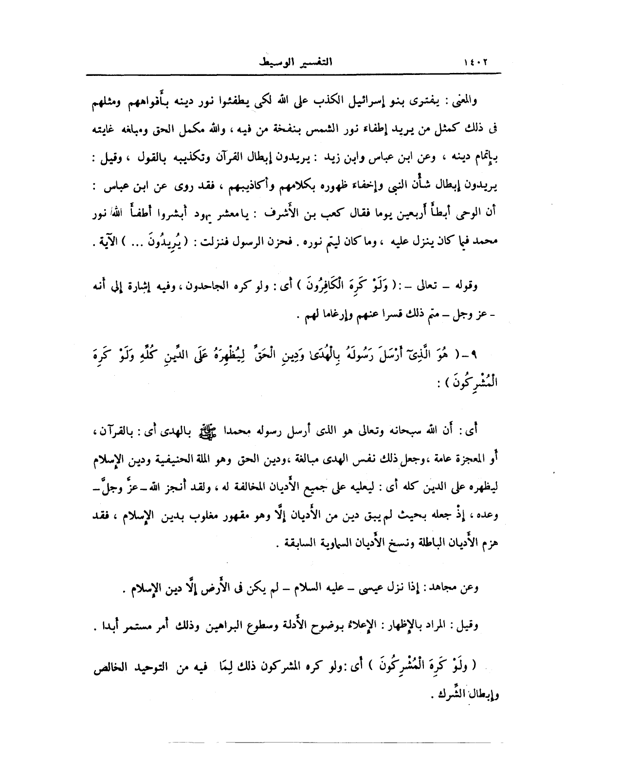 والمعنى: يفتري بنو إِسرائيل الكذب على الله لكي يطفئوا نور دينه بأَفواههم ومثلهم في ذلك كمثل من يريد إِطفاءِ نور الشمس بنفخه من فيه، والله مكمل الحق ومبلغه غايته بإِتمام دينه، وعن ابن عباس وابن زيد: يريدون إِبطال القرآن وتكذبيه بالقول، وقيل: يريدون إِبطال شأن النبي وإِخفاءَ ظهوره بكلامهم وأَكاذيبهم، فقد روي عن ابن عباس: أَن الوحي أَبطأَ أَربعين يوما فقال كعب بن الأَشراف: يا معشر يهود أَبشروا أَطفأَ الله نور محمد فيما كان ينزل عليه، وما كان ليتم نوره. فحزن الرسول فنزلت (يُرِيدُونَ ... ) الآية.