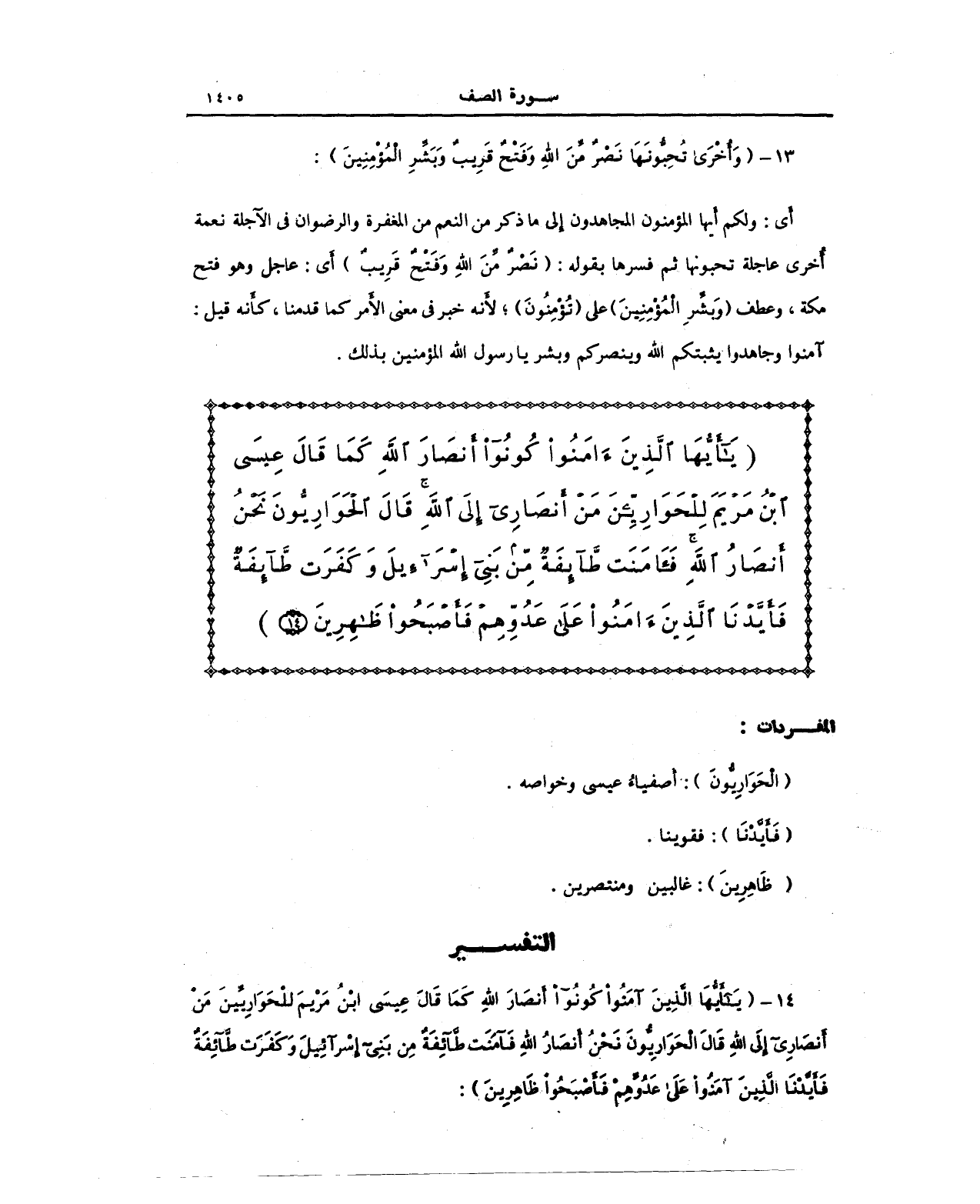 {يَا أَيُّهَا الَّذِينَ آمَنُوا كُونُوا أَنْصَارَ اللَّهِ كَمَا قَالَ عِيسَى ابْنُ مَرْيَمَ لِلْحَوَارِيِّينَ مَنْ أَنْصَارِي إِلَى اللَّهِ قَالَ الْحَوَارِيُّونَ نَحْنُ أَنْصَارُ اللَّهِ فَآمَنَتْ طَائِفَةٌ مِنْ بَنِي إِسْرَائِيلَ وَكَفَرَتْ طَائِفَةٌ فَأَيَّدْنَا الَّذِينَ آمَنُوا عَلَى عَدُوِّهِمْ فَأَصْبَحُوا ظَاهِرِينَ (14)}
