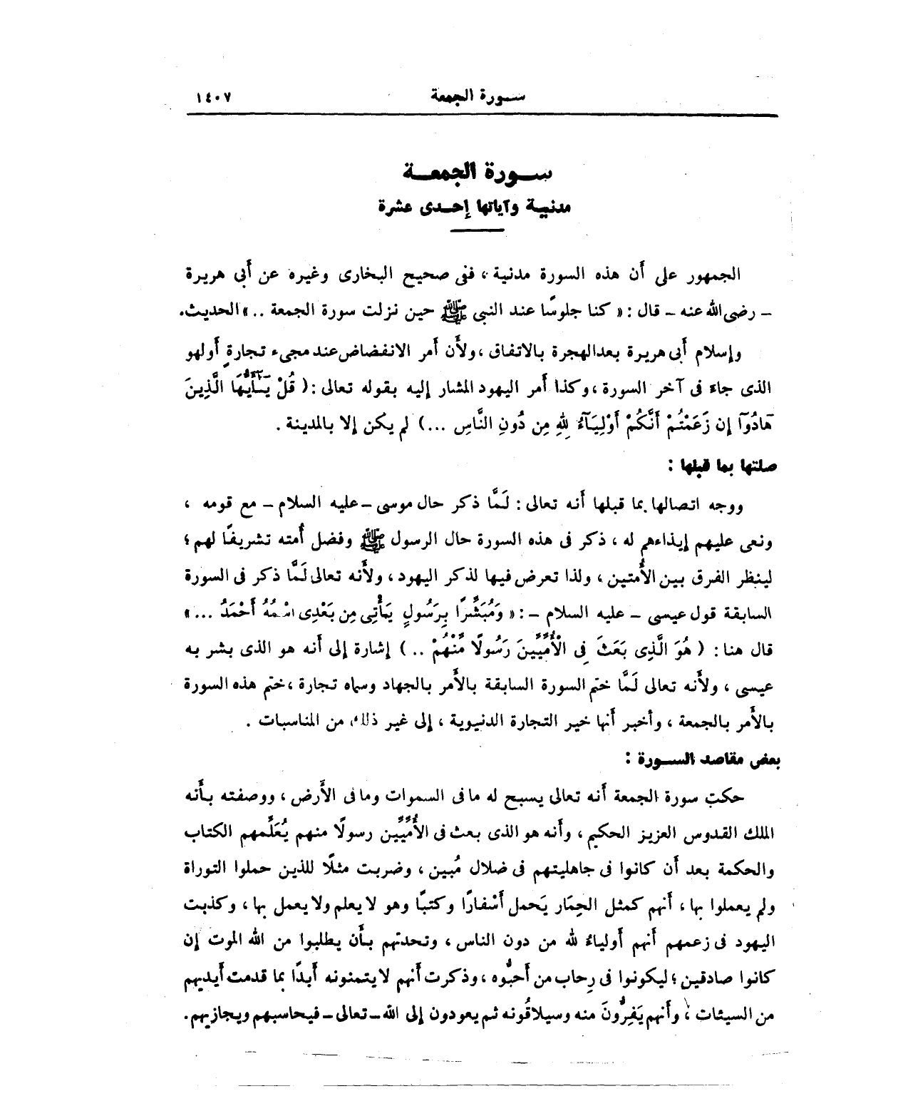 وإِسلام أَبي هريرة بعد الهجرة بالاتفاق، ولأَن أَمر الانفضاض عند مجئ تجارةٍ أَو لهو الذي جاءَ في آخر السورة، وكذا أَمر اليهود المشار إِليه بقوله تعالى: (يَا أَيُّهَا الَّذِينَ هَادُوا إِنْ زَعَمْتُمْ أَنَّكُمْ أَوْلِيَاءُ لِلَّهِ مِنْ دُونِ النَّاسِ) لم يكن إِلا بالمدينة.