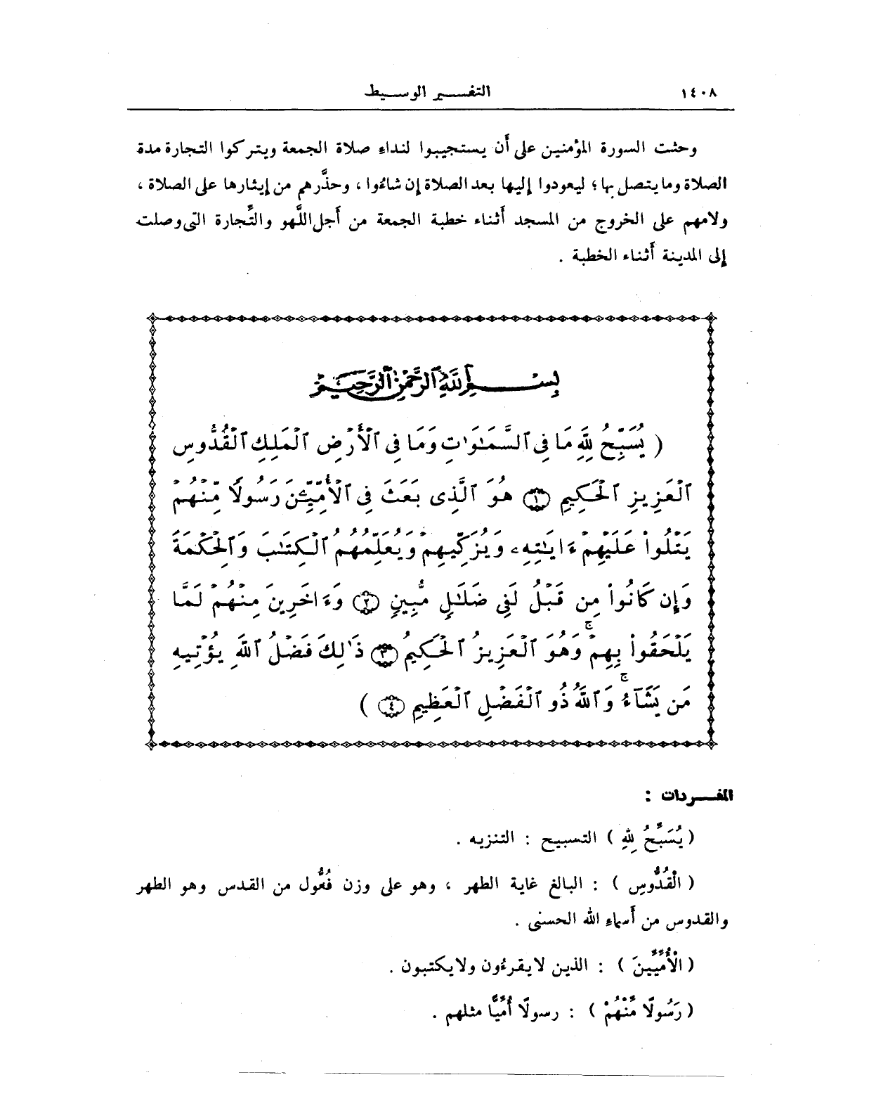 {يُسَبِّحُ لِلَّهِ مَا فِي السَّمَاوَاتِ وَمَا فِي الْأَرْضِ الْمَلِكِ الْقُدُّوسِ الْعَزِيزِ الْحَكِيمِ (1) هُوَ الَّذِي بَعَثَ فِي الْأُمِّيِّينَ رَسُولًا مِنْهُمْ يَتْلُو عَلَيْهِمْ آيَاتِهِ وَيُزَكِّيهِمْ وَيُعَلِّمُهُمُ الْكِتَابَ وَالْحِكْمَةَ وَإِنْ كَانُوا مِنْ قَبْلُ لَفِي ضَلَالٍ مُبِينٍ (2) وَآخَرِينَ مِنْهُمْ لَمَّا يَلْحَقُوا بِهِمْ وَهُوَ الْعَزِيزُ الْحَكِيمُ (3)}