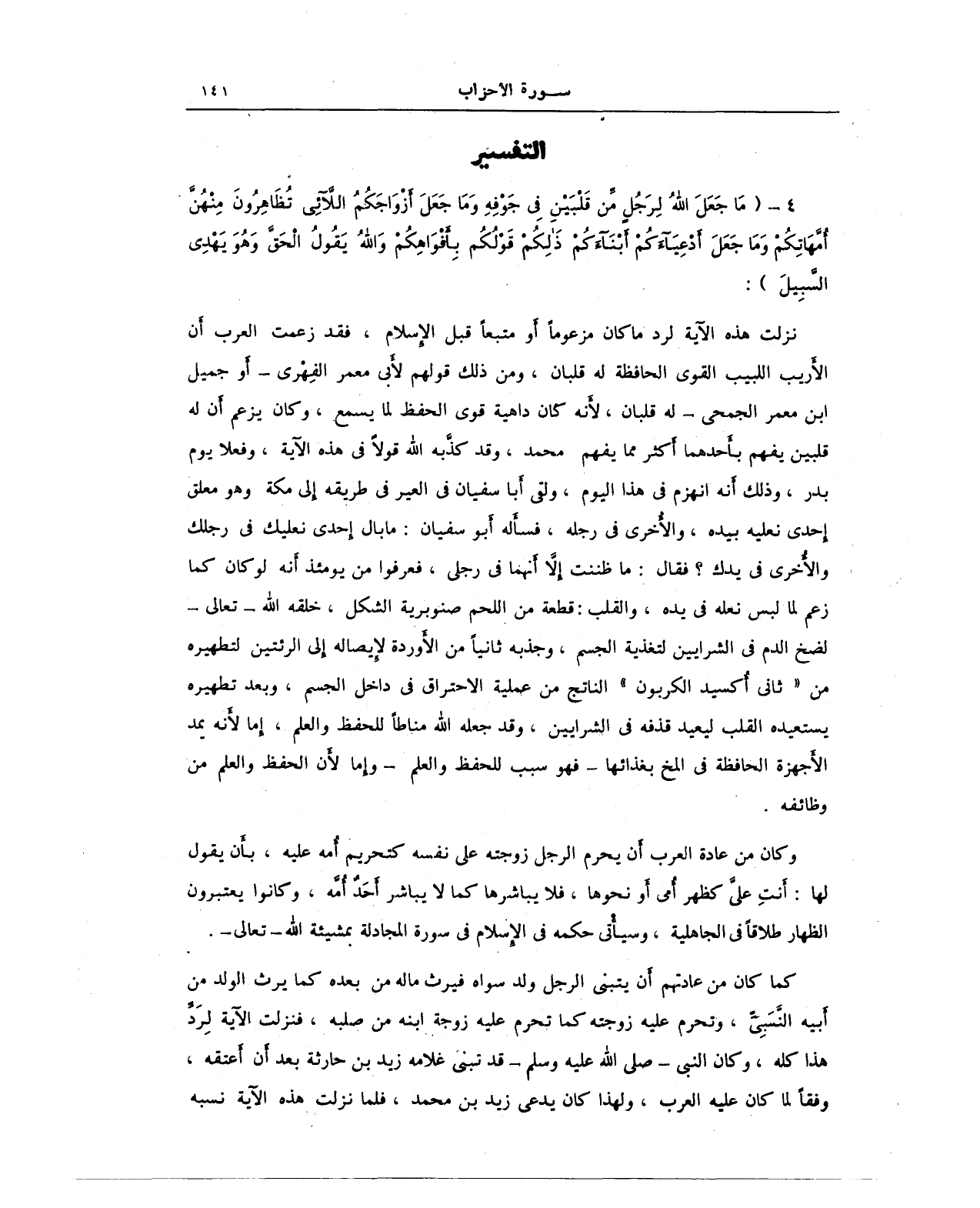 نزلت هذه الآية لرد ما كان مزعومًا أو متبعًا قبل الإِسلام، فقد زعمت العرب أن الأريب اللبيب القوي الحافظة له قلبان، ومن ذلك قولهم لأبي معمر الفِهْري - أو جميل ابن معمر الجمحي - له قلبان، لأنه كان داهية قوى الحفظ لما يسمع، وكان يزعم أن له قلبين يفهم بأحدهما أكثر مما يفهم محمد، وقد كذَّبه الله قولًا في هذه الآية، وفعلًا يوم بدر، وذلك أنه انهزم في هذا اليوم، ولقي أبا سفيان في العير في طريقه إلى مكة وهو معلق إحدى نعليه بيده، والأخرى في رجله، فسأله أبو سفيان: ما بال إحدى نعليك في رجلك والأخرى في يدك؟ فقال: ما ظننت إلاَّ أنهما في رجلي، فعرفوا من يومئذ أنه لو كان كما زعم لما لبس نعله في يده، والقلب: قطعة من اللحم صنوبرية الشكل، خلقه الله - تعالى - لضخ الدم في الشرايين لتغذية الجسم، وجذبه ثانيًا من الأوردة لإيصاله إلى الرئتين لتطهيره من "ثاني أُكسيد الكربون" الناتج من عملية الاحتراق في داخل الجسم، وبعد تطهيره يستعيده القلب ليعيد قذفه في الشرايين، وقد جعله الله مناطًا للحفظ والعلم، إما لأنه يمد الأجهزة الحافظة في المخ بغذائها - فهو سبب للحفظ والعلم - وإما لأن الحفظ والعلم من وظائفه.