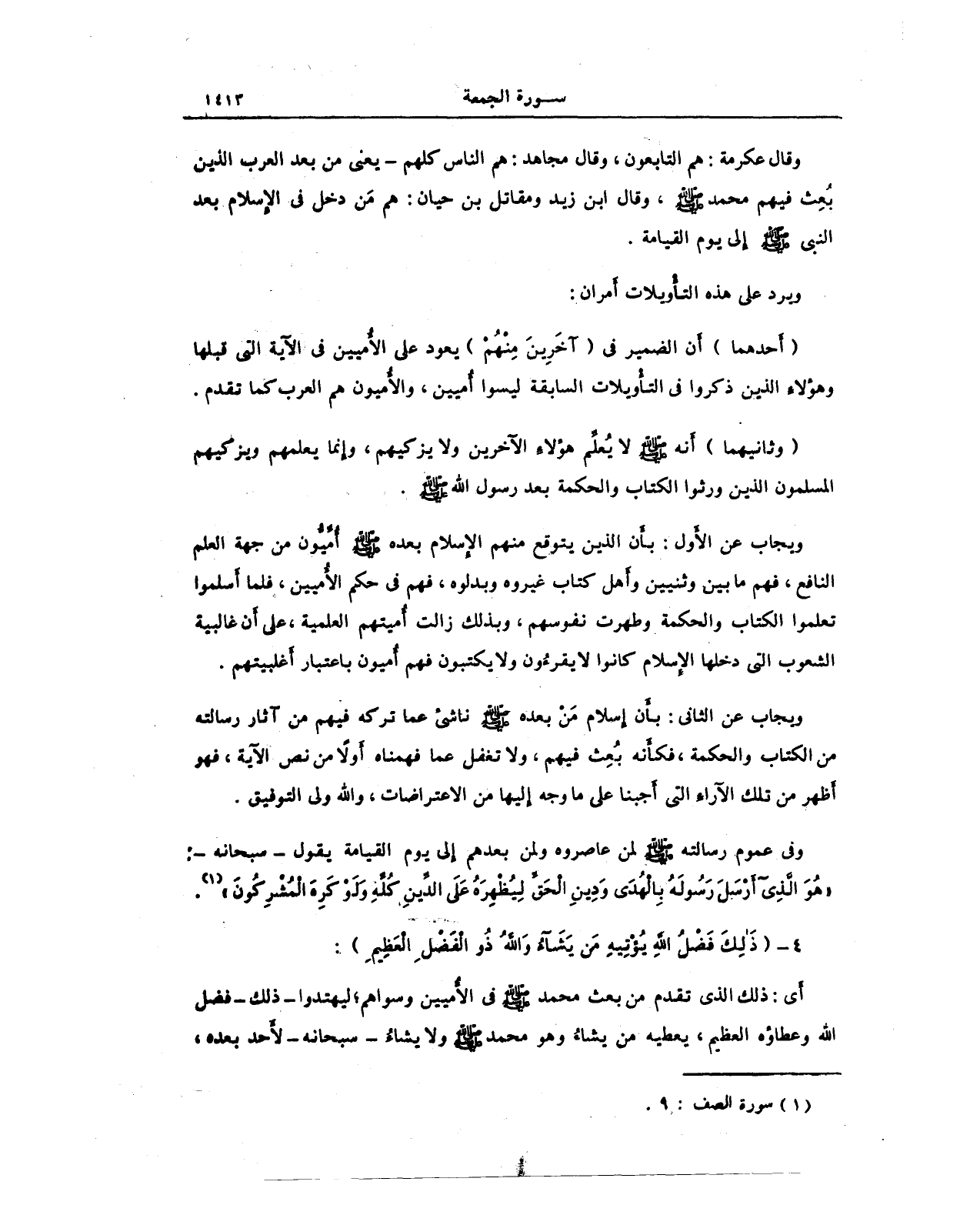 ويجاب عن الأَول: بأَن الذين يتوقع منهم الإسلام بعده صلى الله عليه وسلم أُمِّيُّون من جهة العلم النافع، فهم ما بين وثنيين وأَهل كتاب غيروه وبدلوه، فهم في حكم الأُميين، فلما أَسلموا تعلموا الكتاب والحكمة وطهرت نفوسهم، وبذلك زالت أُميتهم العلمية، على أَن غالبية الشعوب التي دخلها الإِسلام كانوا لا يقرءُون ولا يكتبون فهم أُميون باعتبار أَغلبيتهم.