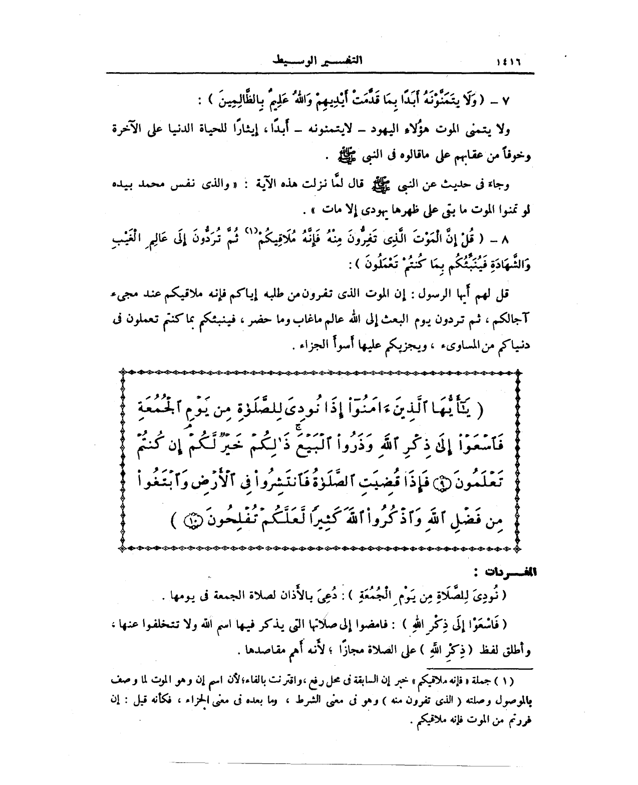 (¬1) جملة "فإنه ملاقيكم" خبر إِن السابقة في محل رفع، واقترنت بالفاء؛ لأن اسم إن وهو الموت لما وصف بالموصول وصلته (الذي تفرون منه) وهو في معنى الشرط، وما بعده في معنى الجزاء، فكأَنه قيل: إِن فررتم من الموت فإِنه ملاقيكم.