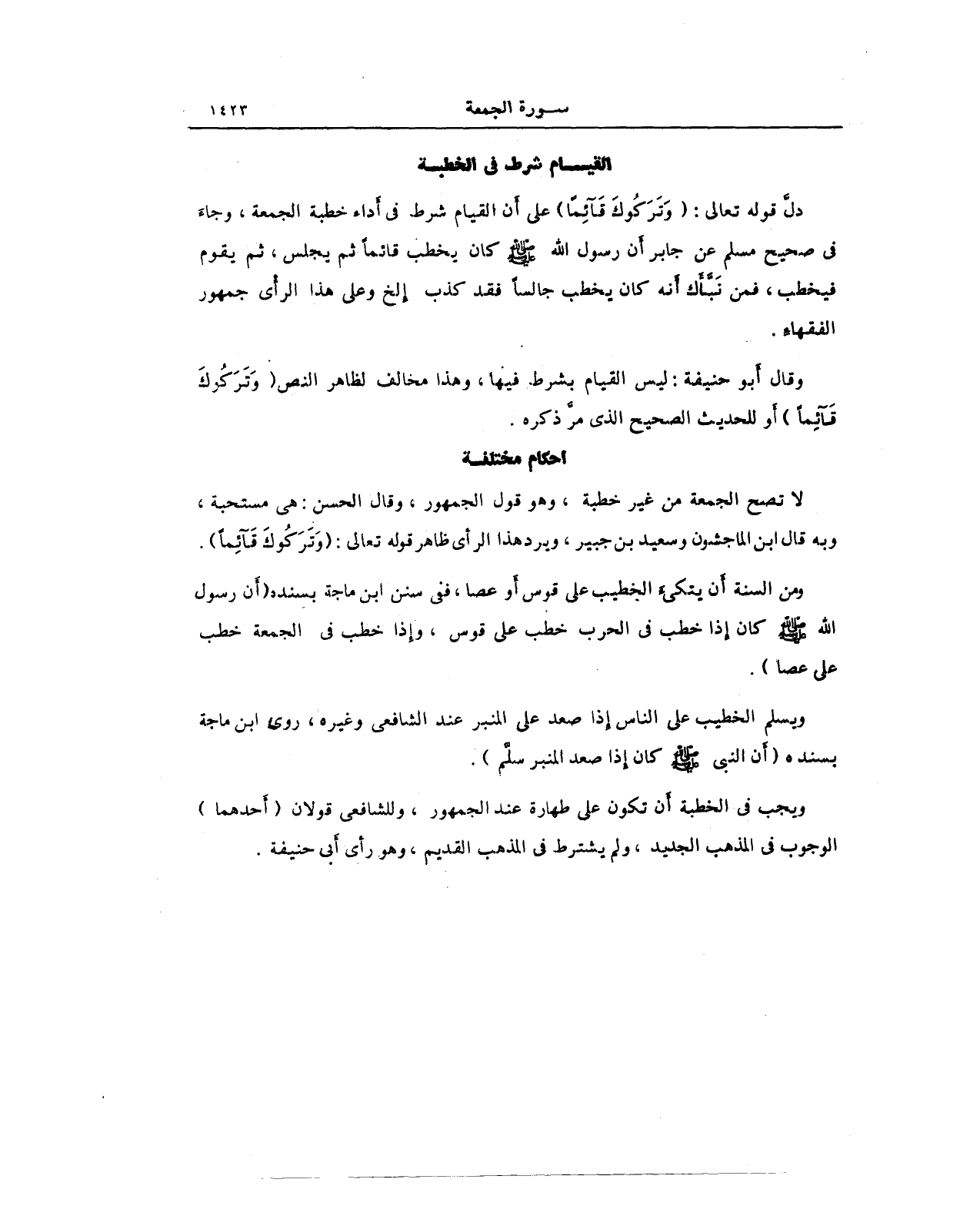 وقال أَبو حنيفة: ليس القيام بشرط فيها، وهذا مخالف لظاهر النص (وَتَرَكُوكَ قَائِمًا) أَو الحديث الصحيح الذي مر ذكره.