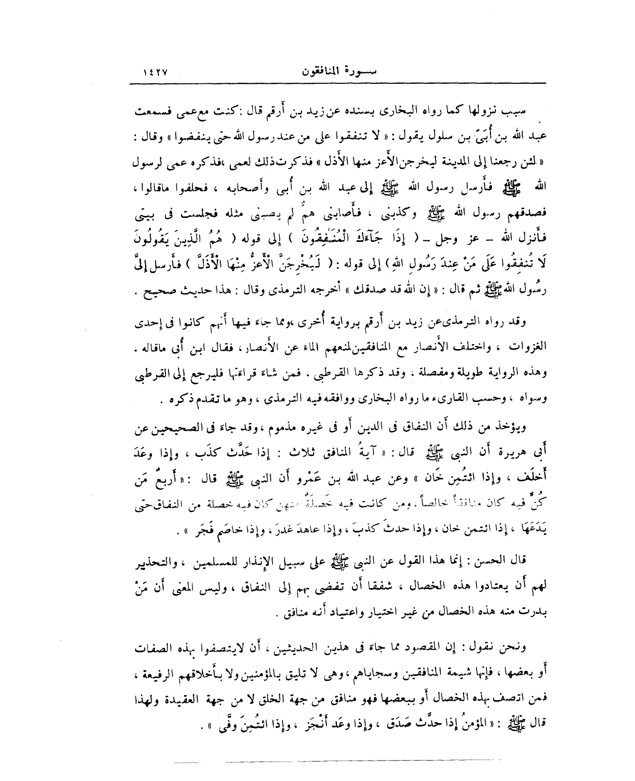 قال الحسن: إِنما هذا القول عن النبي صلى الله عليه وسلم على سبيل الإِنذار للمسلمين، والتحذير لهم أَن يعتادوا هذه الخصال، شفقا أَن تفضي بهم إِلى النفاق، وليس المعنى أَن مَنْ بدرت منه هذه الخصال من غير اختيار واعتياد أَنه منافق.