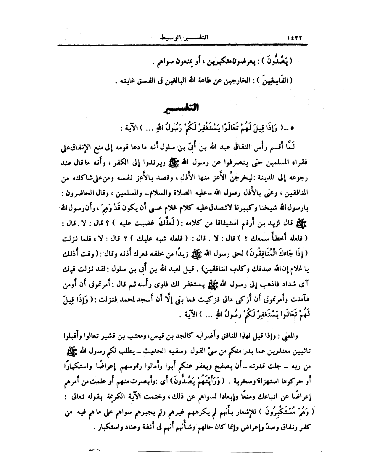 لَمَّا أَقسم رأس النفاق عبد الله بن أَبيّ بن سلول أَنه ما دعا قومه إِلى منع الإِنفاق على فقراءِ المسلمين حتى ينصرفوا عن رسول الله صلى الله عليه وسلم ويرتدوا إِلى الكفر، وأَنه ما قال عند رجوعه إِلى المدينة: ليخرجنَّ الأَعز منها الأَذل، وقصد بالأَعز نفسه ومن على شاكلته من المنافقين، وعنى بالأَذل رسول الله - عليه الصلاة والسلام - والمسلمين، وقال الحاضرون: يا رسول الله شيخنا وكبيرنا لا تصدق عليه كلام غلام عسى أَن يكون قَدْ وَهِمَ، وأَن رسول الله صلى الله عليه وسلم قال لزيد بن أَرقم استيثاقا من كلامه (لَعلَّكَ غضبت عليه)؟ قال: لا قال: (فلعله أَخطأَ سمعك؟) قال لا قال: (فلعله شبه عليك)؟؟ قال لا فلما نزلت (إِذَا جَاءِكَ الْمُنَاِفقُونَ) لحق رسول الله صلى الله عليه وسلم زيدًا من خلفه فعرك أَذنه قال: (وفت أُذنك يا غلام إِن الله صدقك وكذب المنافقين) قيل لعبد الله بن أَبي بن سلول: لقد نزلت فيك آي شداد فاذهب إِلى رسول الله صلى الله عليه وسلم يستغفر لك فلوى رأسه ثم قال: أَمرتموني أَن أُومن فآمنت وأمرتموني أَن أَزكي مالي فزكيت فما بقي إِلَّا أَن أَسجد لمحمد فنزلت: (وَإِذَا قِيلَ لَهُمْ تَعَالَوْا يَسْتَغْفِرْ لَكُمْ رَسُولُ اللَّهِ ... ) الآية: