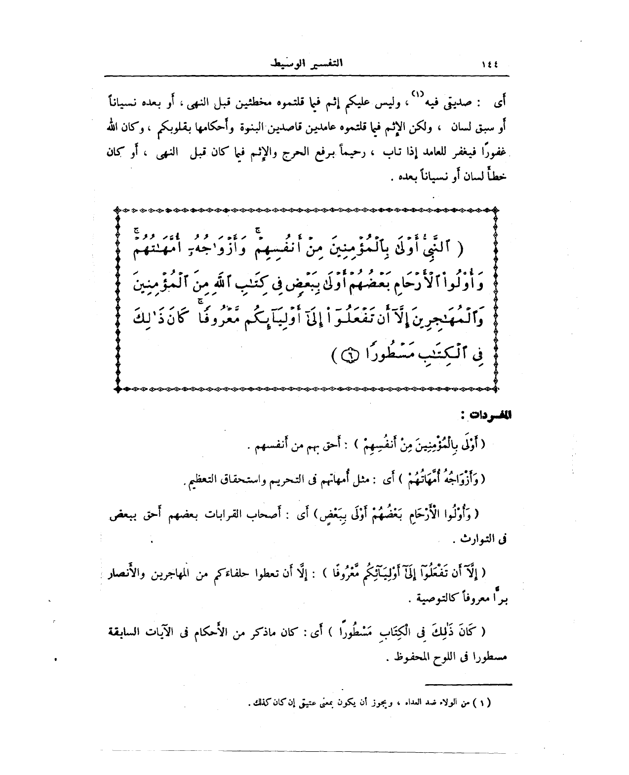 {النَّبِيُّ أَوْلَى بِالْمُؤْمِنِينَ مِنْ أَنْفُسِهِمْ وَأَزْوَاجُهُ أُمَّهَاتُهُمْ وَأُولُوالْأَرْحَامِ بَعْضُهُمْ أَوْلَى بِبَعْضٍ فِي كِتَابِ اللَّهِ مِنَ الْمُؤْمِنِينَ وَالْمُهَاجِرِينَ إِلَّا أَنْ تَفْعَلُوا إِلَى أَوْلِيَائِكُمْ مَعْرُوفًا كَانَ ذَلِكَ فِي الْكِتَابِ مَسْطُورًا (6)}