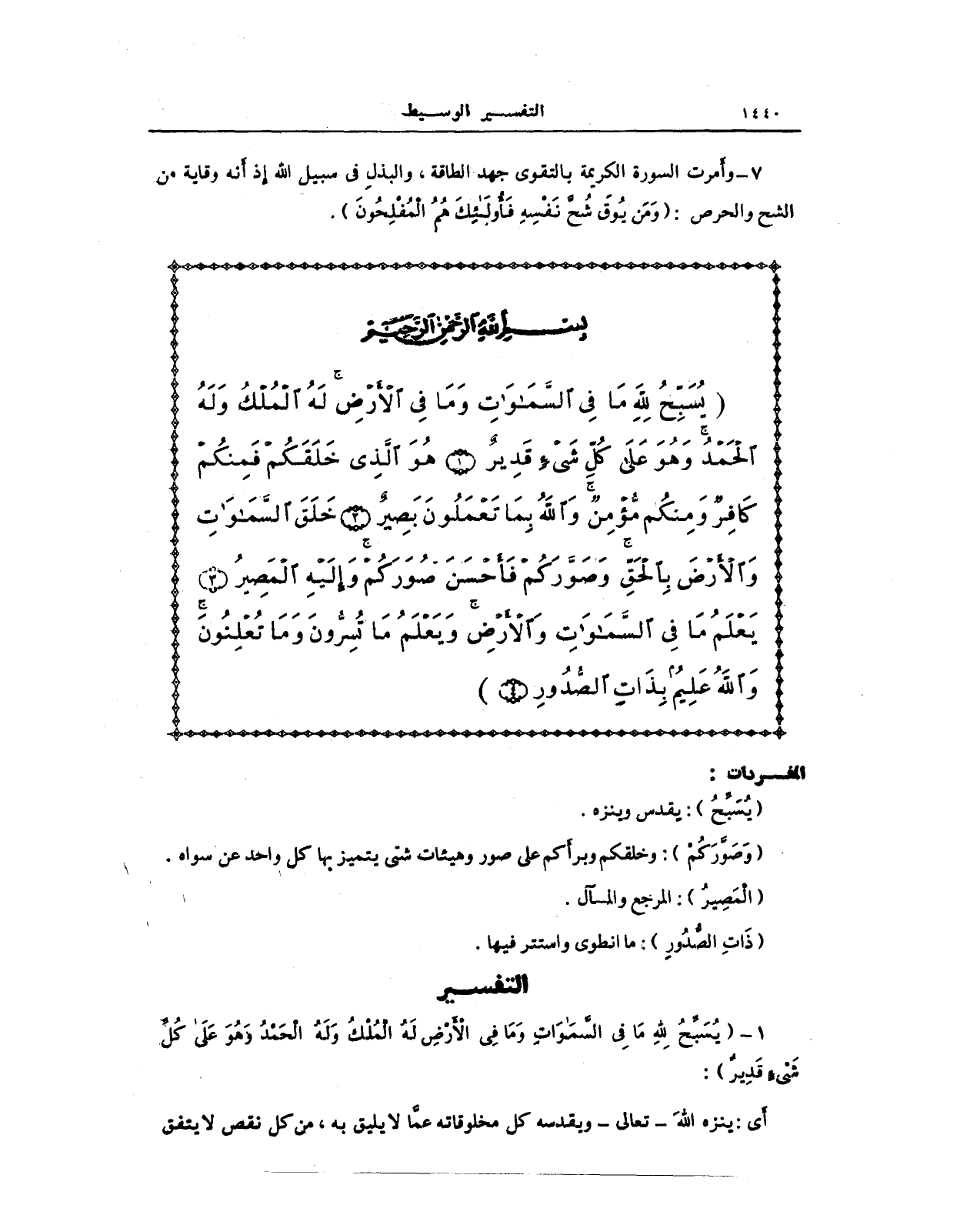 1 - {يُسَبِّحُ لِلَّهِ مَا فِي السَّمَاوَاتِ وَمَا فِي الْأَرْضِ لَهُ الْمُلْكُ وَلَهُ الْحَمْدُ وَهُوَ عَلَى كُلِّ شَيْءٍ قَدِيرٌ (1)}: