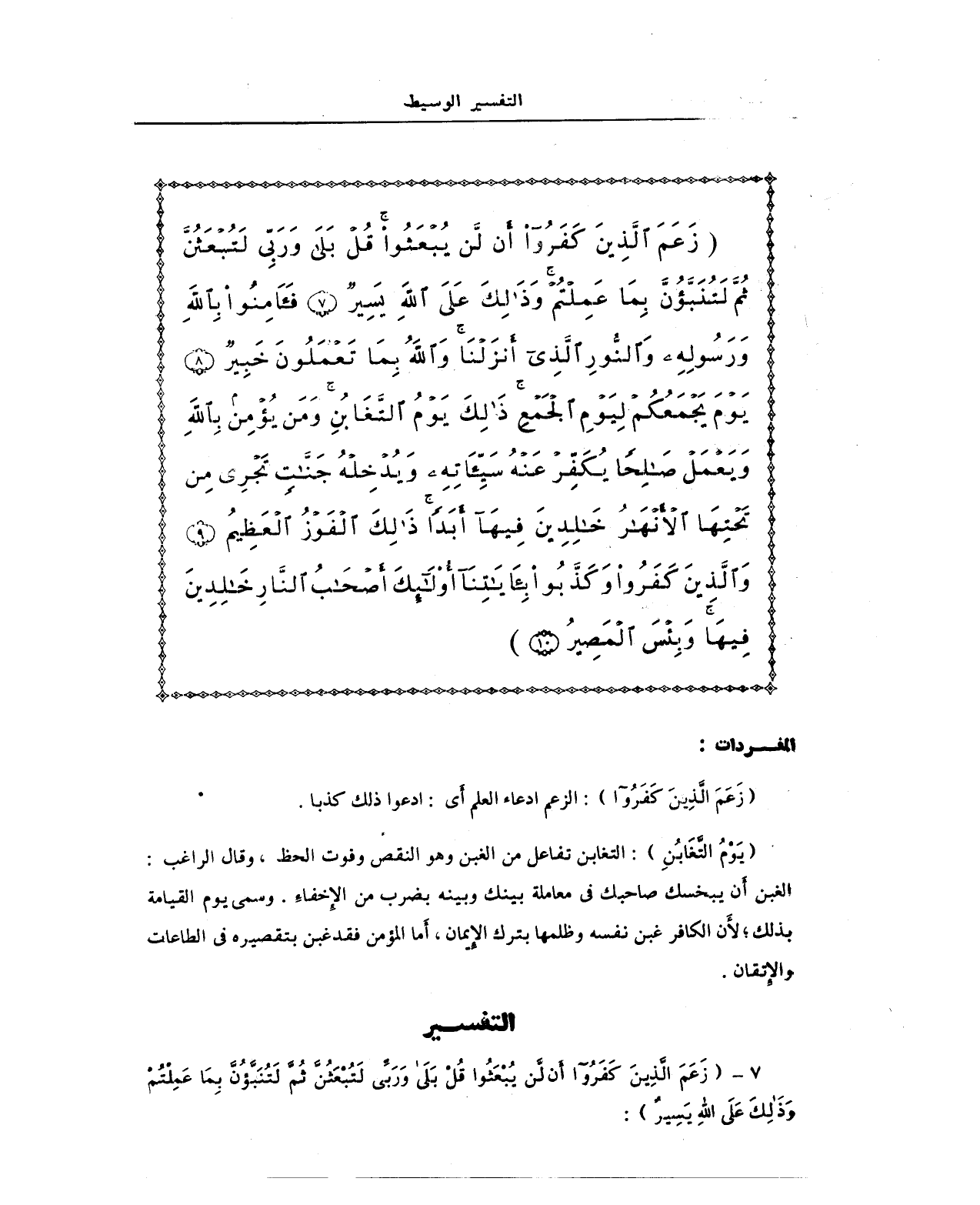 {زَعَمَ الَّذِينَ كَفَرُوا أَنْ لَنْ يُبْعَثُوا قُلْ بَلَى وَرَبِّي لَتُبْعَثُنَّ ثُمَّ لَتُنَبَّؤُنَّ بِمَا عَمِلْتُمْ وَذَلِكَ عَلَى اللَّهِ يَسِيرٌ (7) فَآمِنُوا بِاللَّهِ وَرَسُولِهِ وَالنُّورِ الَّذِي أَنْزَلْنَا وَاللَّهُ بِمَا تَعْمَلُونَ خَبِيرٌ (8) يَوْمَ يَجْمَعُكُمْ لِيَوْمِ الْجَمْعِ ذَلِكَ يَوْمُ التَّغَابُنِ وَمَنْ يُؤْمِنْ بِاللَّهِ وَيَعْمَلْ صَالِحًا يُكَفِّرْ عَنْهُ سَيِّئَاتِهِ وَيُدْخِلْهُ جَنَّاتٍ تَجْرِي مِنْ تَحْتِهَا الْأَنْهَارُ خَالِدِينَ فِيهَا أَبَدًا ذَلِكَ الْفَوْزُ الْعَظِيمُ (9) وَالَّذِينَ كَفَرُوا وَكَذَّبُوا بِآيَاتِنَا أُولَئِكَ أَصْحَابُ النَّارِ خَالِدِينَ فِيهَا وَبِئْسَ الْمَصِيرُ (10)}