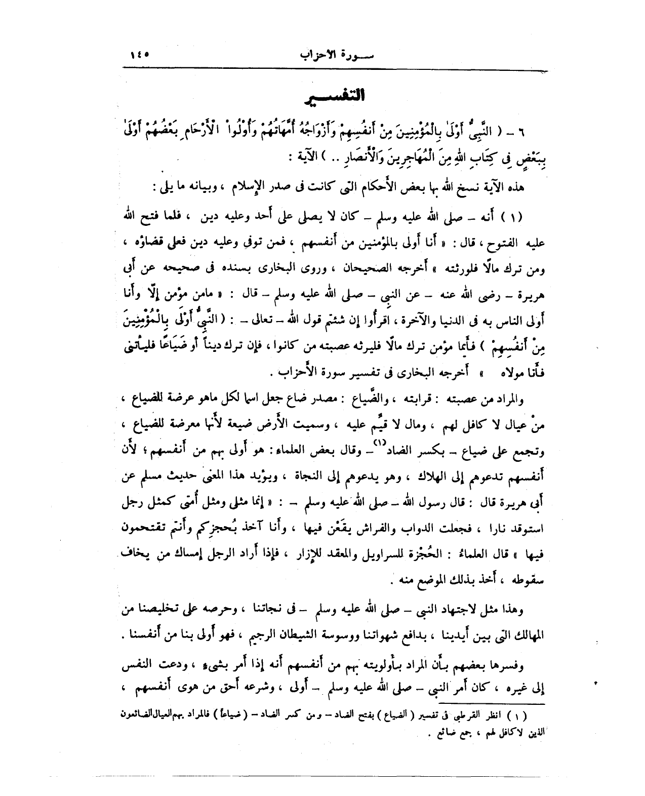 6 - {النَّبِيُّ أَوْلَى بِالْمُؤْمِنِينَ مِنْ أَنْفُسِهِمْ وَأَزْوَاجُهُ أُمَّهَاتُهُمْ وَأُولُوالْأَرْحَامِ بَعْضُهُمْ أَوْلَى بِبَعْضٍ فِي كِتَابِ اللَّهِ مِنَ الْمُؤْمِنِينَ وَالْمُهَاجِرِينَ .. } الآية: