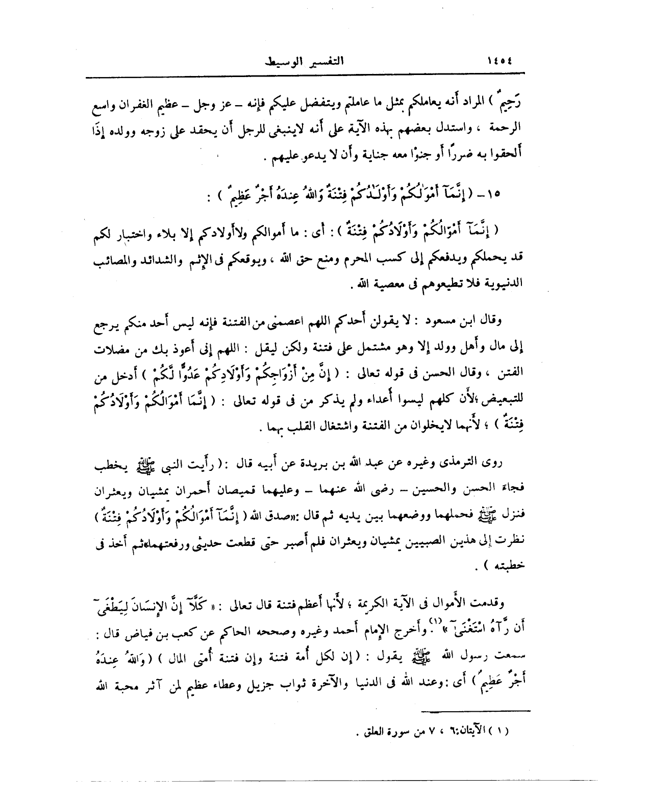 15 - {إِنَّمَا أَمْوَالُكُمْ وَأَوْلَادُكُمْ فِتْنَةٌ وَاللَّهُ عِنْدَهُ أَجْرٌ عَظِيمٌ (15)}:
