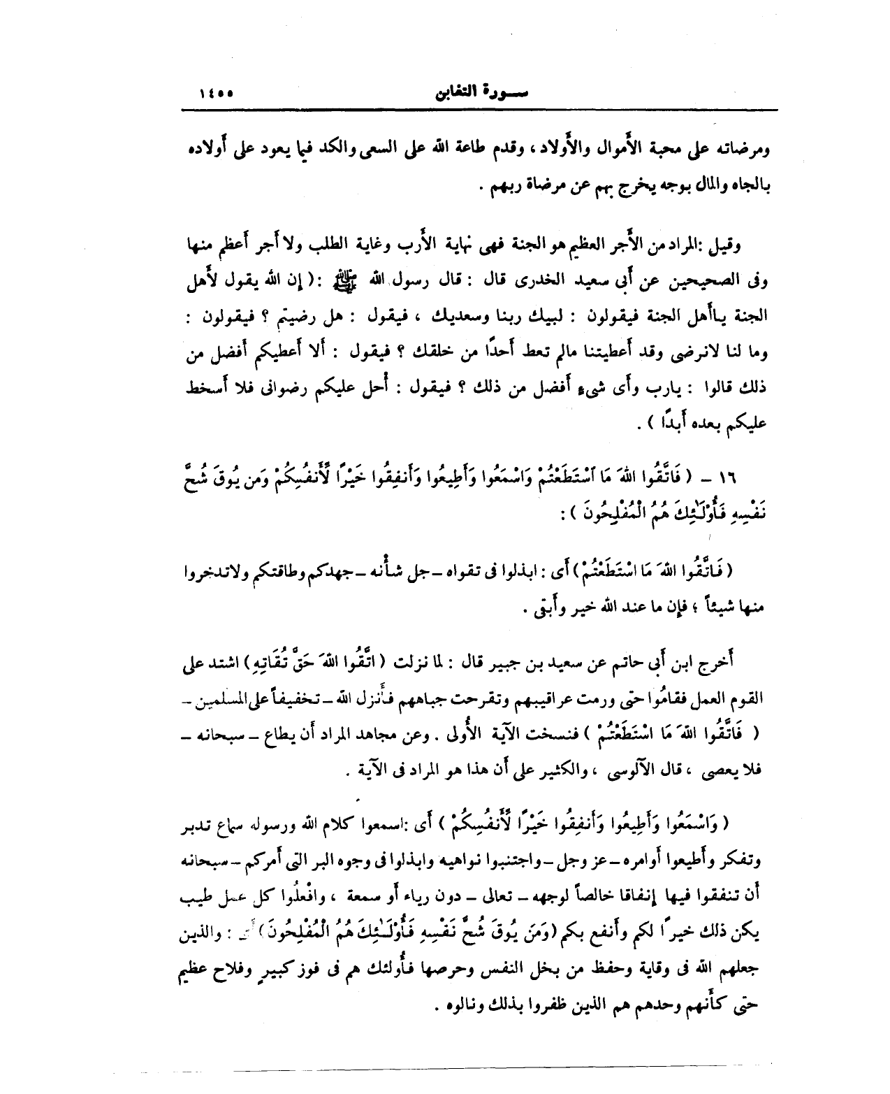16 - {فَاتَّقُوا اللَّهَ مَا اسْتَطَعْتُمْ وَاسْمَعُوا وَأَطِيعُوا وَأَنْفِقُوا خَيْرًا لِأَنْفُسِكُمْ وَمَنْ يُوقَ شُحَّ نَفْسِهِ فَأُولَئِكَ هُمُ الْمُفْلِحُونَ (16)}: