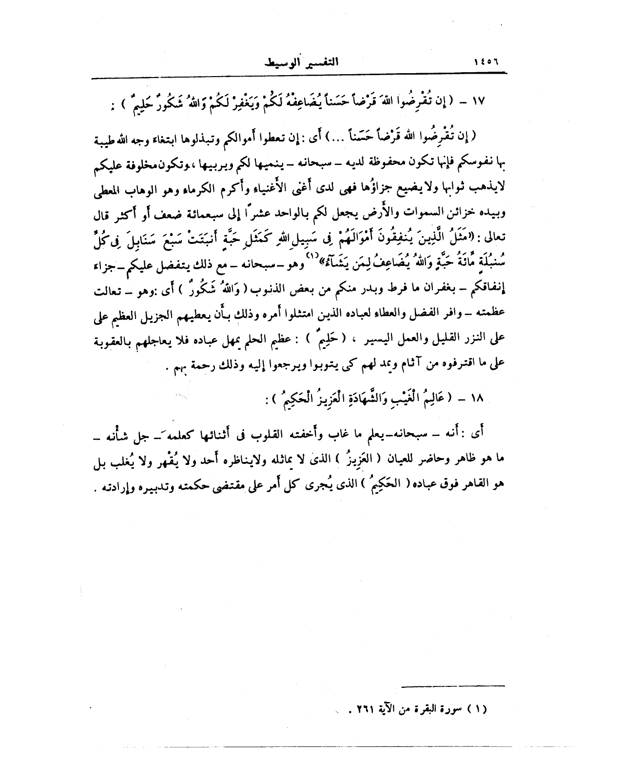 (إِنْ تُقْرِضُوا اللَّهَ قَرْضًا حَسَنًا ... ) أَي: إن تعطوا أَموالكم وتبذلوا ابتغاءَ وجه الله طيبة بها نفوسكم فإِنها تكون محفوظة لديه - سبحانه - ينميها لكم ويربيها، وتكون مخلوفة عليكم لا يذهب ثوابها ولا يضيع جزاؤُها فهي لدي أَغنى الأَغنياء وأَكرم الكرماءِ وهو الوهاب المعطي وبيده خزائن السموات والأَرض يجعل لكم بالواحد عشرًا إِلى سبعمائة ضعف أَو أَكثر قال تعالى (مَثَلُ الَّذِينَ يُنفِقُونَ أَمْوَالَهُمْ فِي سَبِيلِ اللَّهِ كَمَثَلِ حَبَّةٍ أَنْبَتَتْ سَبْعَ سَنَابِلَ فِي كُلِّ سُنْبُلَةٍ مِائَةُ حَبَّةٍ وَاللَّهُ يُضَاعِفُ لِمَنْ يَشَاءُ) (¬1) وهو - سبحانه - مع ذلك يتفضل عليكم - جزاءَ إِنفاقكم - بغفران ما فرط وبدر منكم من بعض الذنوب (وَالله شَكُورٌ) أَي: وهو - تعالت عظمته - وافر الفضل والعطاءِ لعباده الذين امتثلوا أَمره وذلك بأَن يعطيهم الجزيل العظيم على النزر القليل والعمل اليسير، (حَلِيمٌ): عظيم الحلم يمهل عباده فلا يعاجلهم بالعقوبة على ما اقترفوه من آثام ويمد لهم كي يتوبوا ويرجعوا إِليه وذلك رحمة بهم.