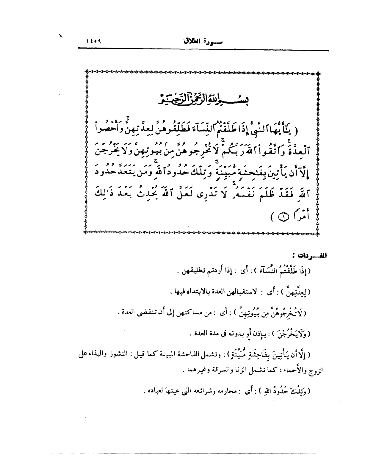 {يَا أَيُّهَا النَّبِيُّ إِذَا طَلَّقْتُمُ النِّسَاءَ فَطَلِّقُوهُنَّ لِعِدَّتِهِنَّ وَأَحْصُوا الْعِدَّةَ وَاتَّقُوا اللَّهَ رَبَّكُمْ لَا تُخْرِجُوهُنَّ مِنْ بُيُوتِهِنَّ وَلَا يَخْرُجْنَ إِلَّا أَنْ يَأْتِينَ بِفَاحِشَةٍ مُبَيِّنَةٍ وَتِلْكَ حُدُودُ اللَّهِ وَمَنْ يَتَعَدَّ حُدُودَ اللَّهِ فَقَدْ ظَلَمَ نَفْسَهُ لَا تَدْرِي لَعَلَّ اللَّهَ يُحْدِثُ بَعْدَ ذَلِكَ أَمْرًا (1)}