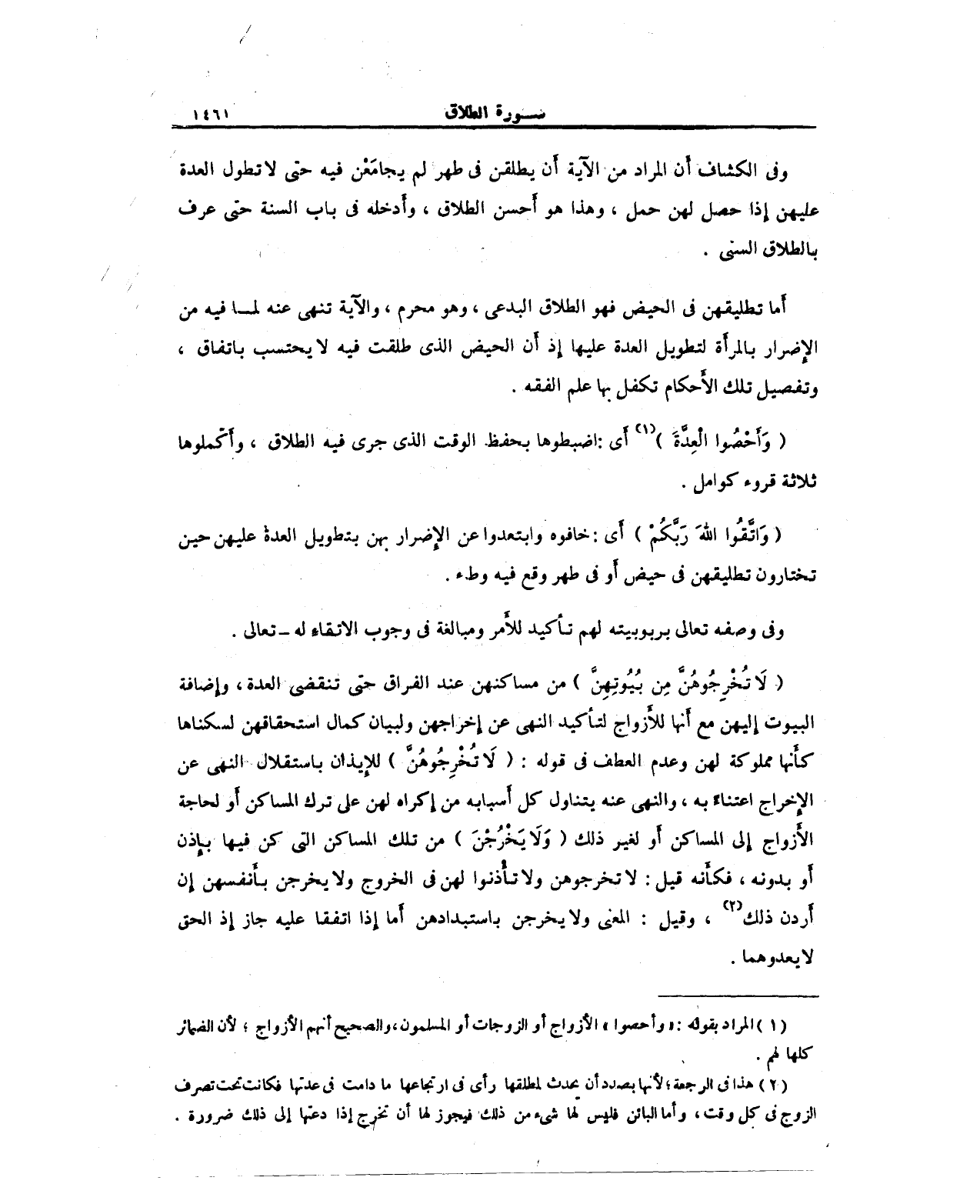 (لا تُخْرِجُوهُنَّ مِنْ بُيُوتِهِنَّ) من مساكنهن عند الفراق حتى تنقضي العدة، وإِضافة البيوت إِليهن مع أَنها للأَزواج لتأكيد النهي عن إِخراجهن ولبيان كمال استحقاقهن لسكناها كأَنها مملوكة لهن وعدم العطف في قوله: (لا تُخْرِجُوهُنَّ) للإيذان باستقلال النهي عن الإِخراج اعتناءَ به، والنهي عنه يتناول كل أَسبابه من إِكراه لهن على ترك المساكن أَو لحاجة الأَزواج إِلى المساكن أو لغير ذلك (لا تُخْرِجُوهُنَّ) من تلك المساكن التي كن فيها بإِذن أو بدونه، فكأَنه قيل: لا تخرجوهن ولا تأذنوا لهن في الخروج ولا يخرجن بأَنفسهن إِن أَردن ذلك (¬2)، وقيل: المعنى ولا يخرجن باستبدادهن أَما إِذا اتفقا عليه جاز إِذ الحق لا يعدوهما.