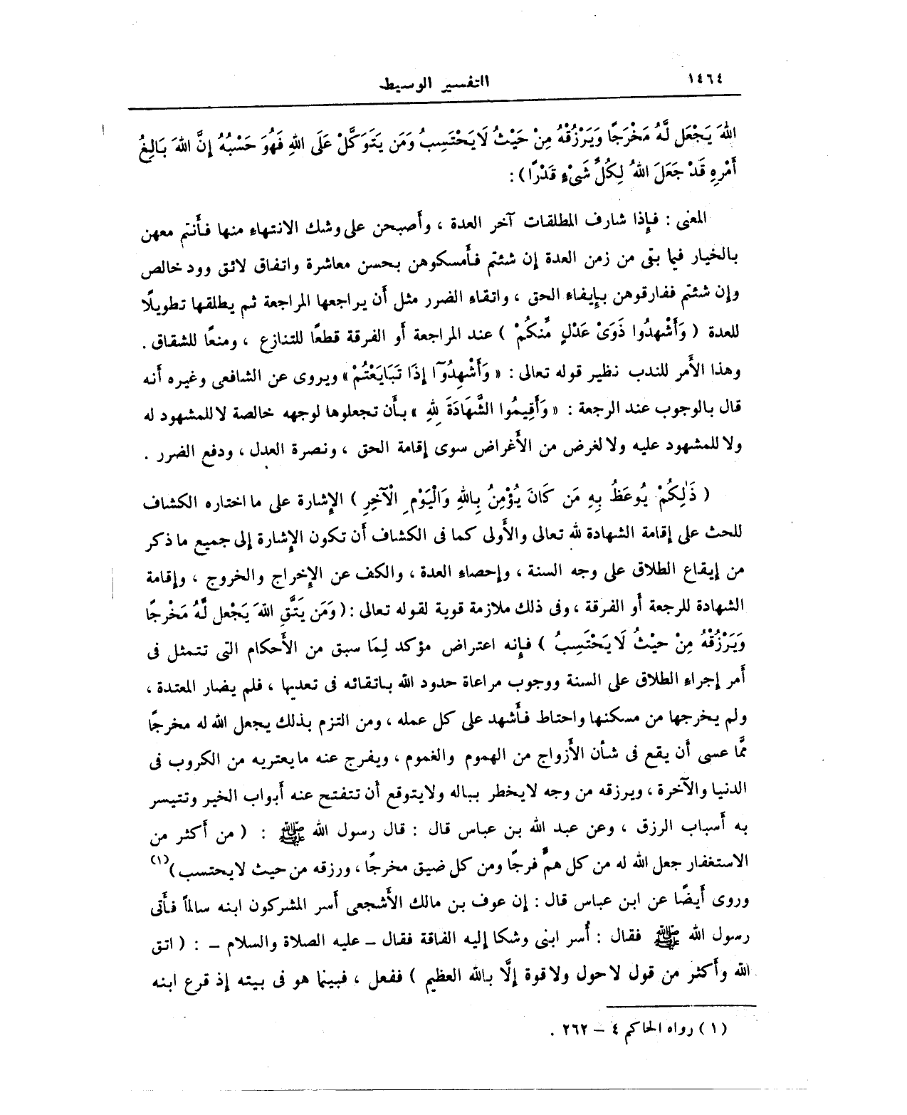 (ذَلِكُمْ يُوعَظُ بِهِ مَنْ كَانَ يُؤْمِنُ بِاللَّهِ وَالْيَوْمِ الآخِرِ) الإِشارة على ما اختاره الكشاف للحث على إِقامة الشهادة لله تعالى والأَولى كما في الكشاف أَن تكون الإِشارة إِلى جميع ما ذكر من إيقاع الطلاق على وجه السنة، وإِحصاءِ العدة، والكف عن الإِخراج والخروج، وإِقامة الشهادة للرجعة أَو الفرقة، وفي ذلك ملازمة قوية لقوله تعالى: (وَمَنْ يَتَّقِ اللَّهَ يَجْعَلْ لَهُ مَخْرَجًا وَيَرْزُقْهُ مِنْ حَيْثُ لا يَحْتَسِبُ) فإِنه اعتراض مؤكد لِمَا سبق في الأَحكام التي تتمثل في أَمر إِجراءِ الطلاق على السنة ووجوب مراعاة حدود الله باتقائه في تعديها، فلم يضار المعتدة، ولم يخرجها من مسكنها واحتاط فأَشهد على كل عمله، ومن التزم بذلك يجعل الله له مخرجًا ممَّا عسى أن يقع في شأَن الأزواج من الهموم والغموم ويفرج عنه ما يعتريه من الكروب في الدنيا والآخرة، ويرزقه من وجه لا يخطر بباله ولا يتوقع أَن تتفتح عنه أَبواب الخير وتتيسر به أَسباب الرزق، وعن عبد الله بن عباس قال: قال رسول الله صلى الله عليه وسلم: (من أَكثر من الاستغفار جعل الله له من كل همٍّ فرجًا ومن كل ضيق مخرجًا، ورزقه من حيث لا يحتسب) (¬1) وروي أَيضا عن ابن عباس قال: إِن عوف بن مالك الأَشجعي أَسر المشركون ابنه سالمًا فأَتى رسول الله صلى الله عليه وسلم فقال: أُسر ابني وشكا إِليه الفاقة فقال - عليه الصلاة والسلام -: (اتق الله وأَكثر من قول لا حول ولا قوة إِلا بالله العظيم) ففعل، فبينما هو في بيته إِذ قرع ابنه