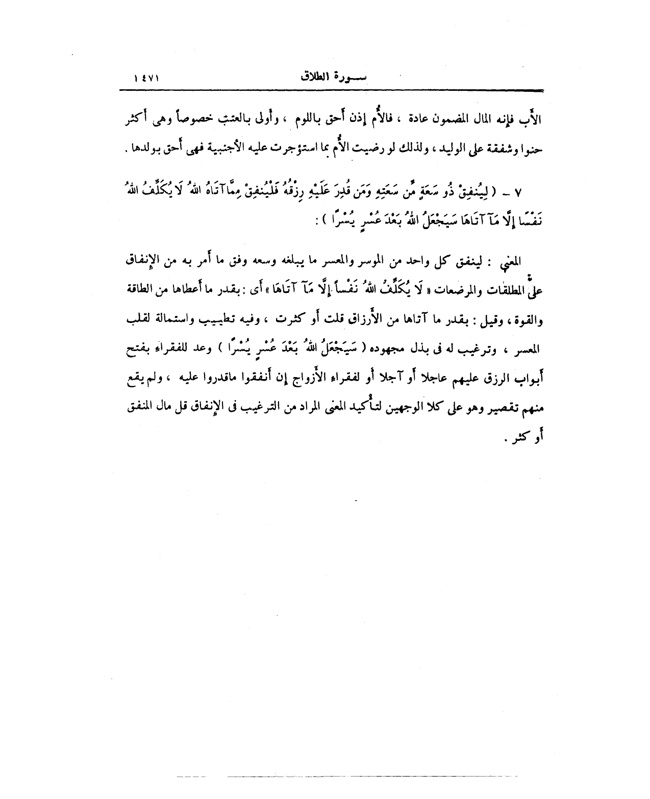 المعنى: لينفق كل واحد من الموسر والمعسر ما يبلغه وسعه وفق ما أَمر به من الإِنفاق على المطلقات والمرضعات (لا يُكَلِّفُ اللَّهُ نَفْسًا إِلا مَا آتَاهَا) أَي: بقدر ما أَعطاها من الطاقة والقوة، وقيل: بقدر ما آتاها من الأَرزاق قلت أَو كثرت، وفيه تطييب واستمالة لقلب المعسر، وترغيب له في بذل مجهوده (سَيَجْعَلُ اللَّهُ بَعْدَ عُسْرٍ يُسْرًا) وعد للفقراءِ بفتح أَبواب الرزق عليهم عاجلا أو آجلا أَو لفقراءِ الأَزواج إِن أَنفقوا ما قدروا عليه، ولم يقع منهم تقصير وهو على كلا الوجهين لتأكيد المعنى المراد من الترغيب في الإِنفاق قل مال المنفق أَو كثر.