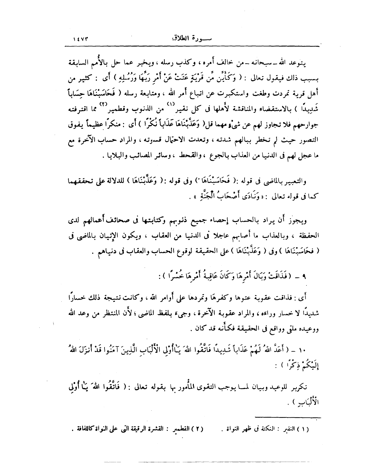 يتوعد الله - سبحانه - من خالف أَمره، وكذب رسله، ويخبر عما حل بالأُمم السابقة بسب ذلك فيقول تعالى: (وَكَأَيِّنْ مِنْ قَرْيَةٍ عَتَتْ عَنْ أَمْرِ رَبِّهَا وَرُسُلِهِ) أَي: كثير من أَهل قرية تمردت وطغت واستكبرت عن اتباع أَمر الله، ومتابعة رسله (فَحَاسَبْنَاهَا حِسَابًا شَدِيدًا) بالاستقضاءِ والمناقشة لأَهلها في كل نقير (¬1) من الذنوب وقطمير (¬2) مما اقترفته جوارحهم فلا تجاوز لهم عن شيءٍ مهما قل (وَعَذَّبْنَاهَا عَذَابًا نُكْرًا) أَي: منكرًا عظيمًا يفوق التصور حيث لم تخطر ببالهم شدته، وتعدت الاحتمال قسوته، والمراد حساب الآخرة مع ما عجل لهم في الدنيا من العذاب بالجوع، والقحط، وسائر المصائب والبلايا.