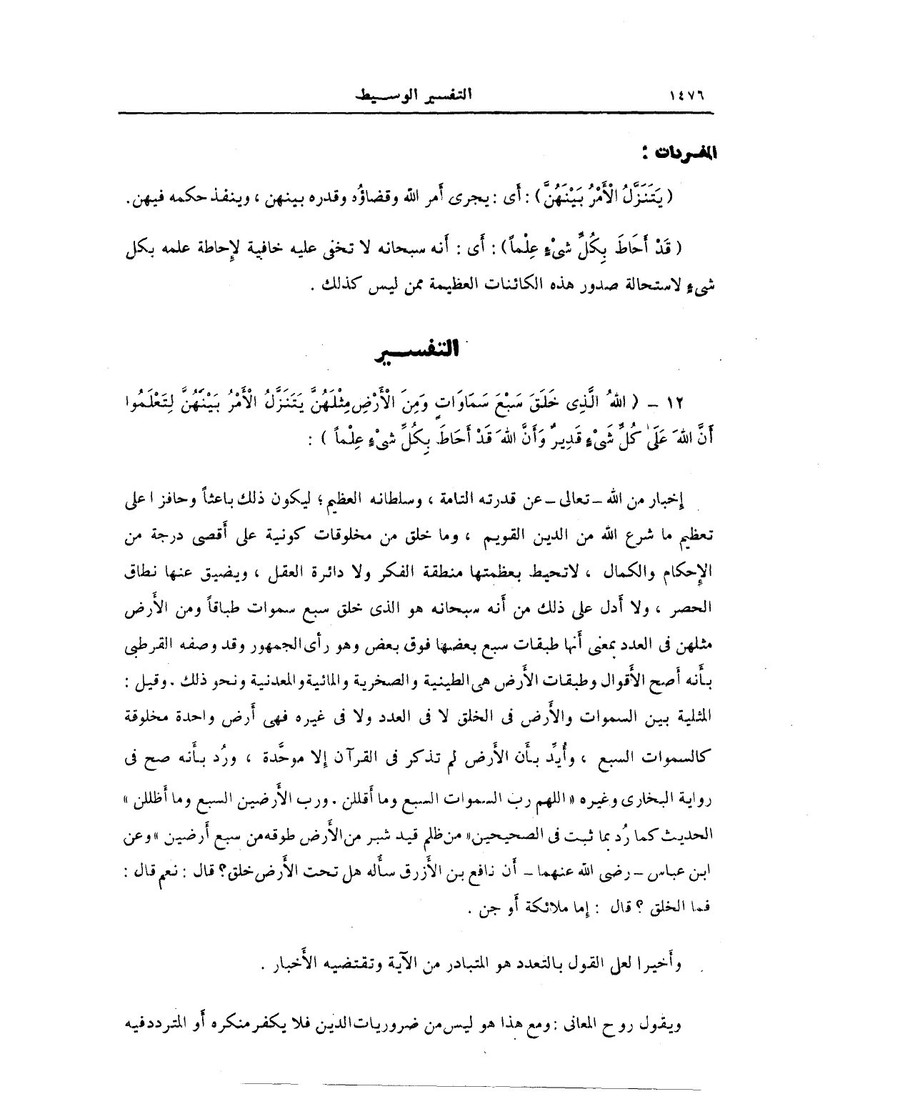 إِخبار من الله تعالى - عن قدرته التامة، وسلطانه العظيم؛ ليكون ذلك باعثًا وحافزا على تعظيم ما شرع الله من الدين القويم، وما خلق من مخلوقات كونية على أَقصى درجة من الإِحكام والكمال، لا تحيط بعظمتها منطقة الفكر ولا دائرة العقل، ويضيق عنها نطاق الحصر، ولا أَدل على ذلك من أَنه سبحانه هو الذي خلق سبع سموات طباقًا ومن الأَرض مثلهن في العدد بمعنى أَنها طبقات سبع بعضها فوق بعض وهو رأَي الجمهور وقد وصفه القرطبي بأَنه أَصح الأَقوال وطبقات الأَرض هي الصينية والصخرية والمائية والمعدنية ونحو ذلك. وقيل: المثلية بين السموات والأَرض في الخلق لا في العدد ولا في غيره فهي أَرض واحدة مخلوقة كالسموات السبع، وأُيِّد بأَن الأَرض لم تذكر في القرآن إِلا موحَّدة، ورُد بأَنه صح في رواية البخاري وغيره "اللهم رب السموات السبع وما أَقللن ورب الأَرضين السبع وما أَظللن" الحديث كما ردُ بما ثبت في الصحيحين "من ظلم قيد شبر من الأَرض طوقه من سبع أَرضين" وعن ابن عباس - رضي الله عنهما - أَن نافع بن الأَزرق سأَله هل تحت الأَرض خلق؟ قال نعم قال: فما الخلق؟ قال: إِما ملائكة أَو جن.