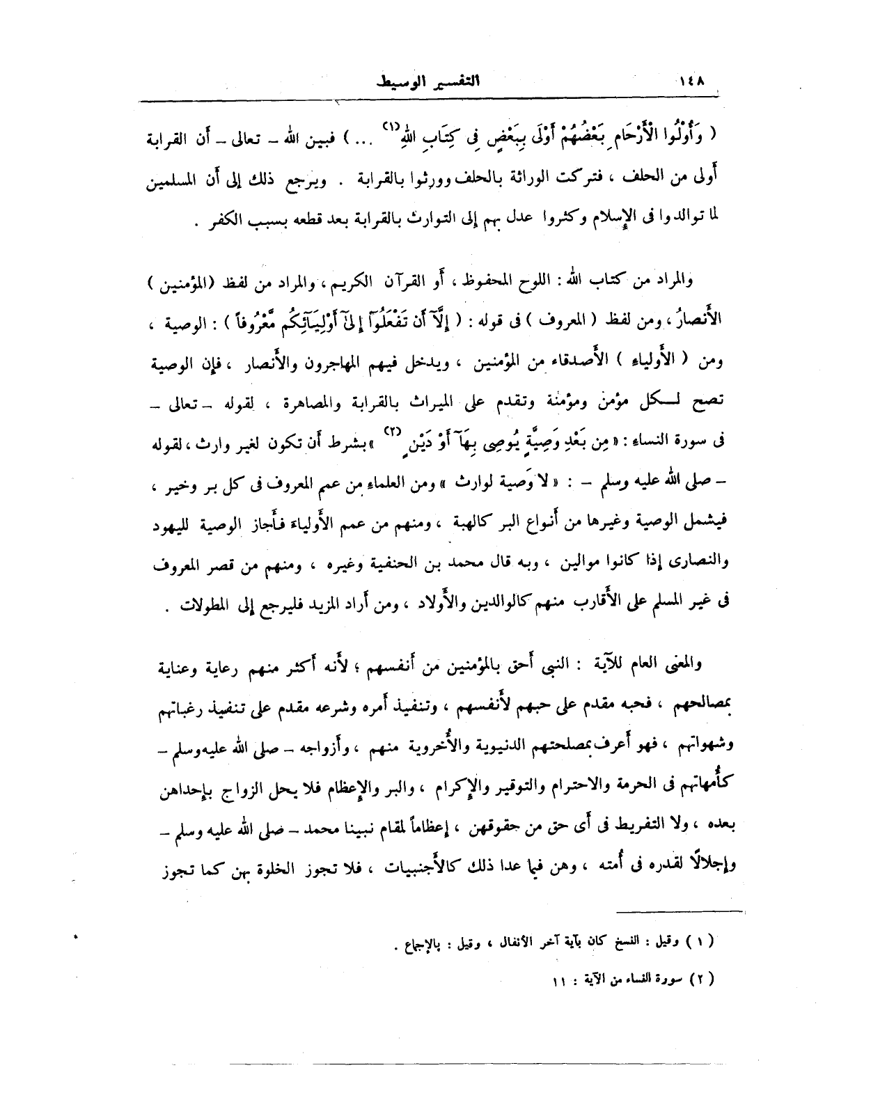 والمراد من كتاب الله: اللوح المحفوظ، أو القرآن الكريم، والمراد من لفظ (المؤمنين) الأَنصارُ، ومن لفظ (المعروف) في قوله: {إلَّا أَنْ تَفْعَلُوا إِلَى أَوْلِيَائِكُمْ مَعْرُوفًا}: الوصية، ومن (الأولياءِ) الأَصدقاء من المؤمنين، ويدخل فيهم المهاجرون والأنصار، فإن الوصية تصح لكل مؤمن ومؤمنة وتقدم على الميراث بالقرابة والمصاهرة، - لقوله - تعالى - في سورة النساء: {مِنْ بَعْدِ وَصِيَّةٍ يُوصَى بِهَا أَوْ دَيْنٍ (¬2)} بشرط أن تكون لغير وارث، قوله - صلى الله عليه وسلم -: "لا وَصية لوارث" ومن العلماءِ من عمم المعروف في كل بر وخير، فيشمل الوصية وغيرها من أنواع البر كالهبة، ومنهم من عمم الأولياء فأجاز الوصية لليهود والنصارى إذا كانوا موالين، وبه قال محمَّد بن الحنفية. وغيره، ومنهم من قصر المعروف في غير المسلم على الأَقارب منهم كالوالدين والأَولاد، ومن أراد المزيد فليرجع إلى المطولات.